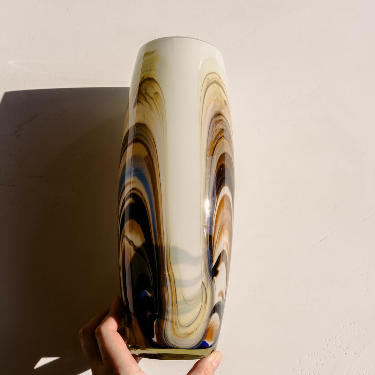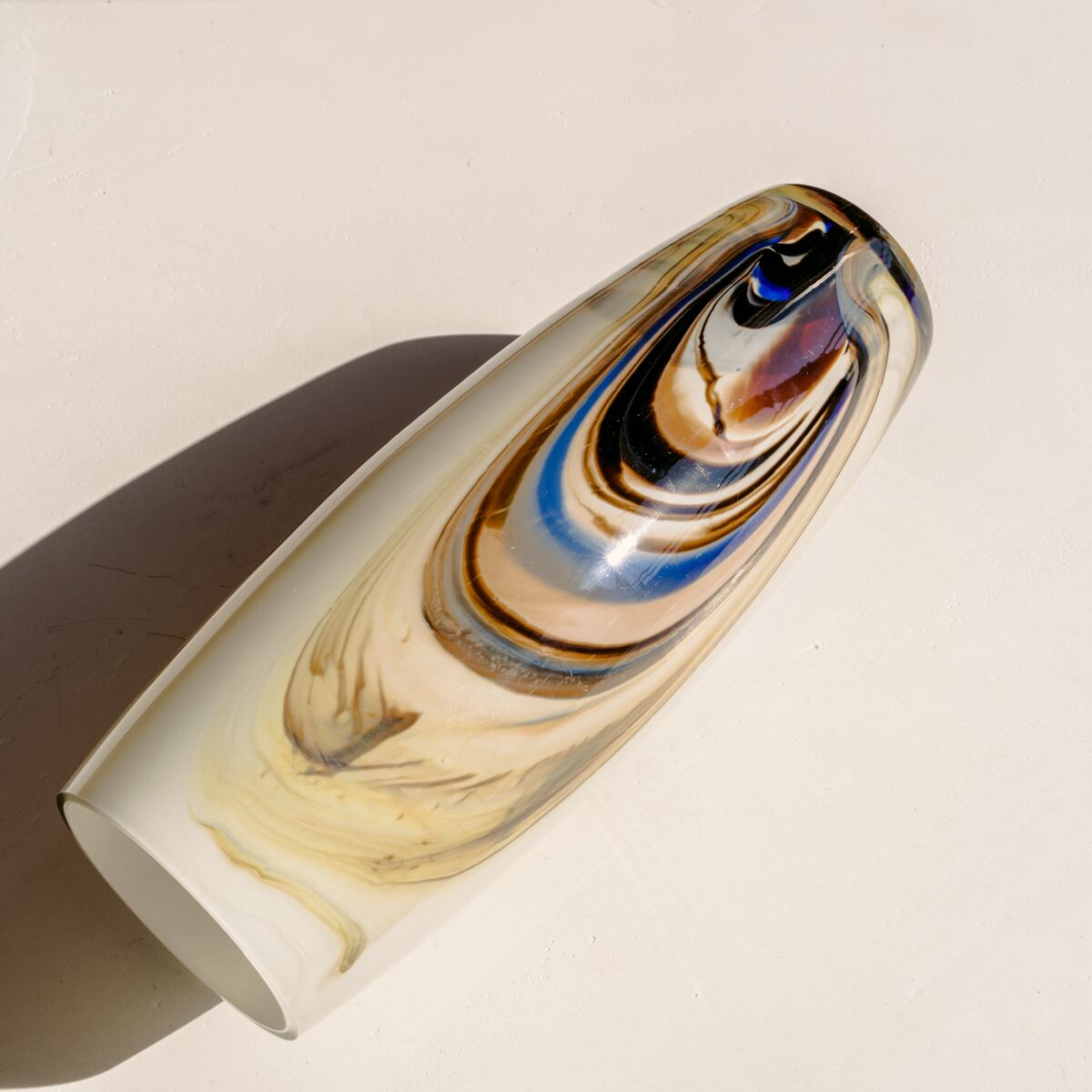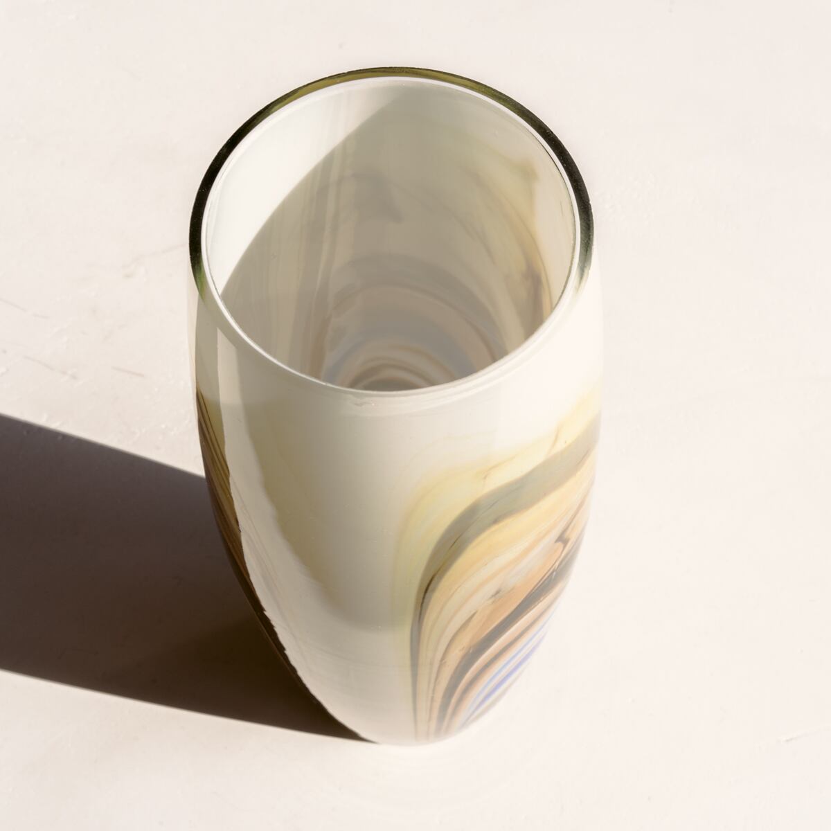 すっきりと美しい卵型のデザインで、ホワイトをベースに、ブラウン、イエロー、ブルーなどさまざまな色が入り混じったマーブル模様で彩られています。