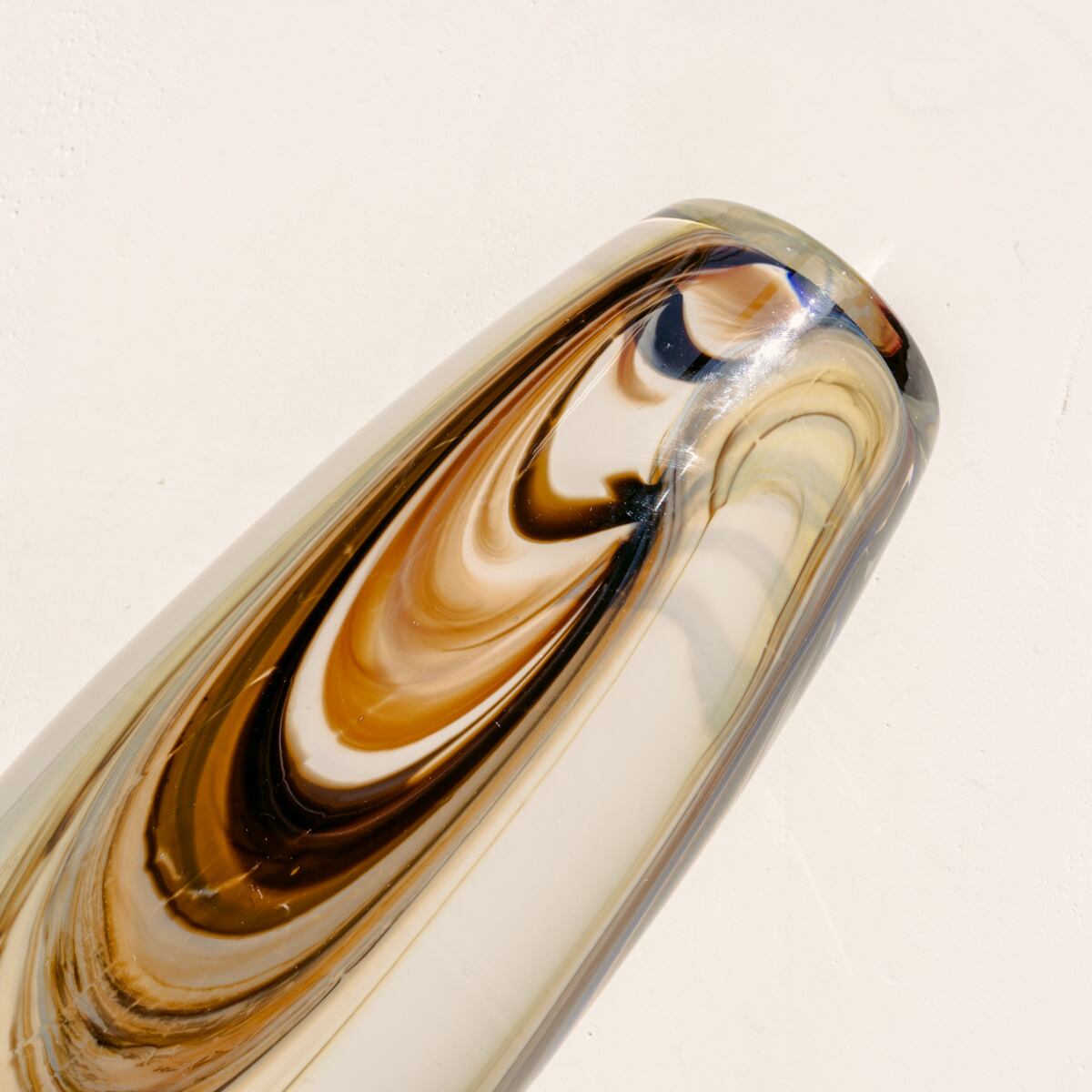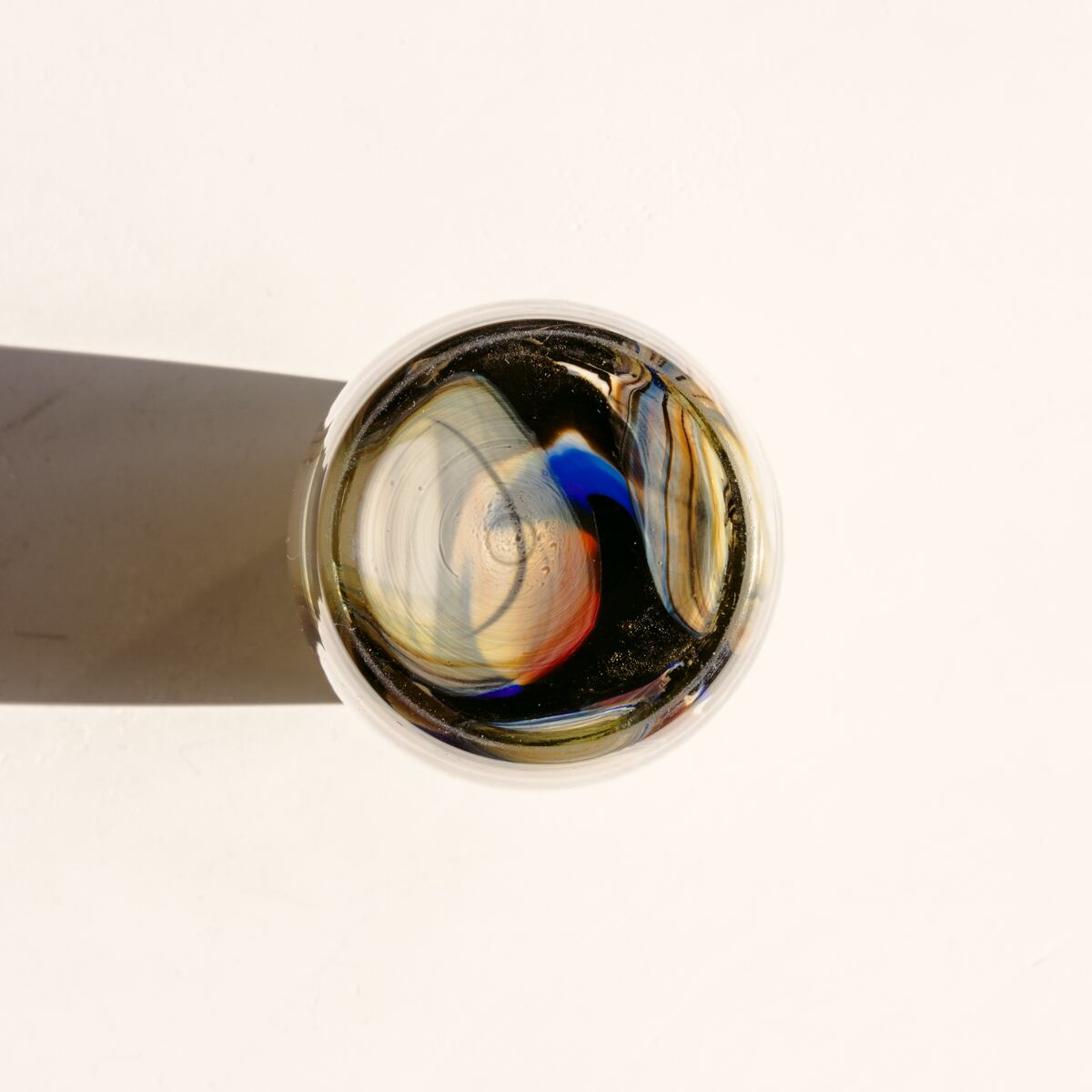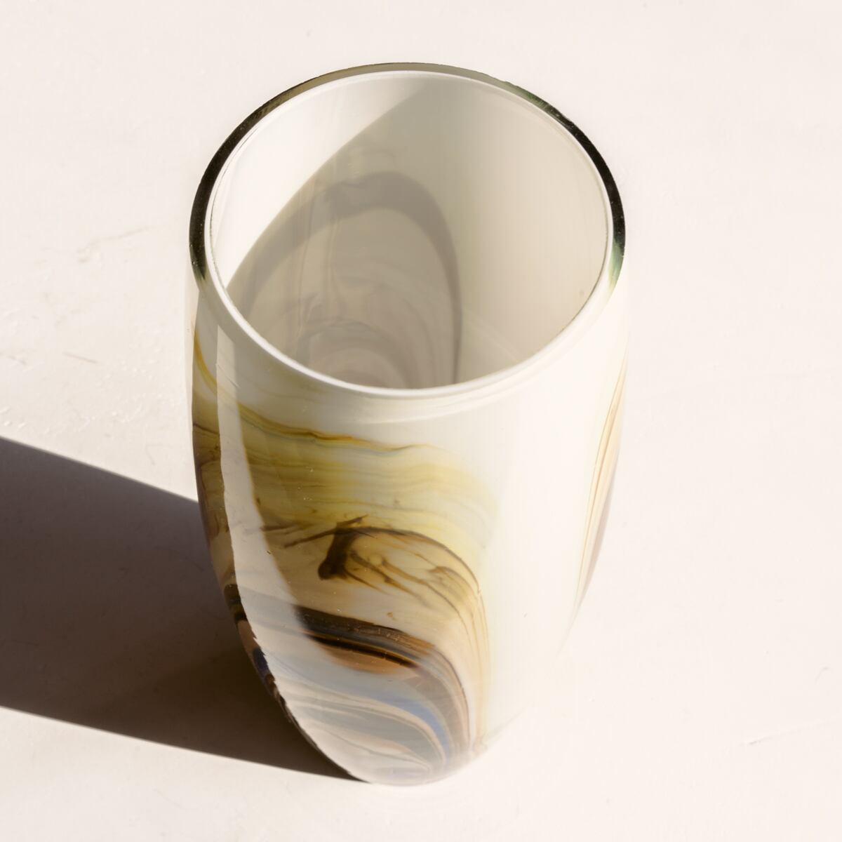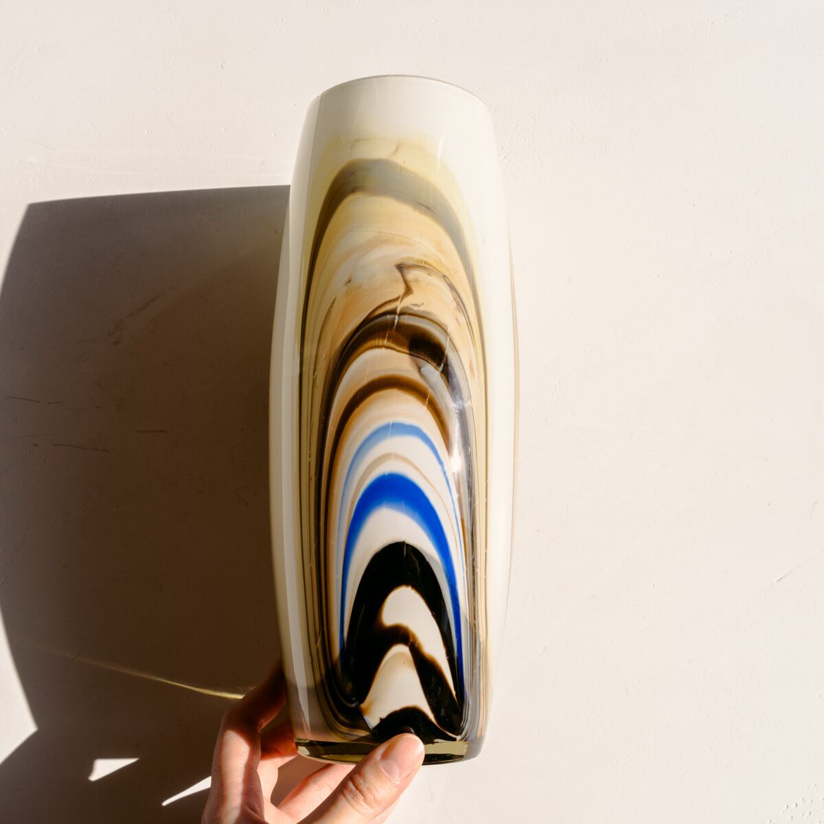 すっきりと美しい卵型のデザインで、ホワイトをベースに、ブラウン、イエロー、ブルーなどさまざまな色が入り混じったマーブル模様で彩られています。