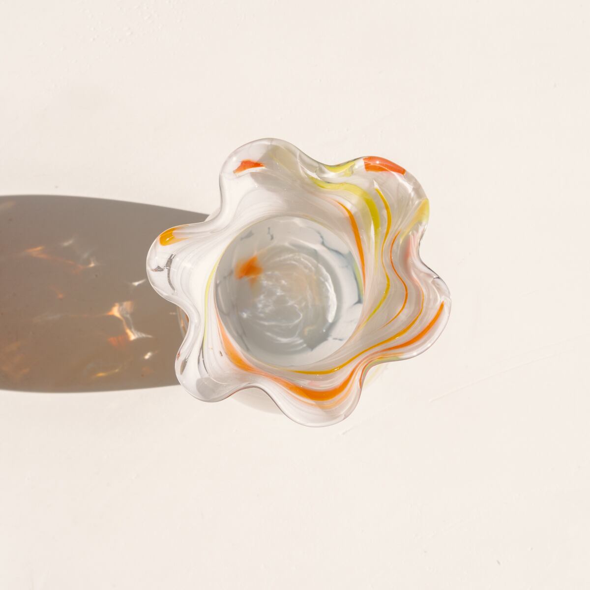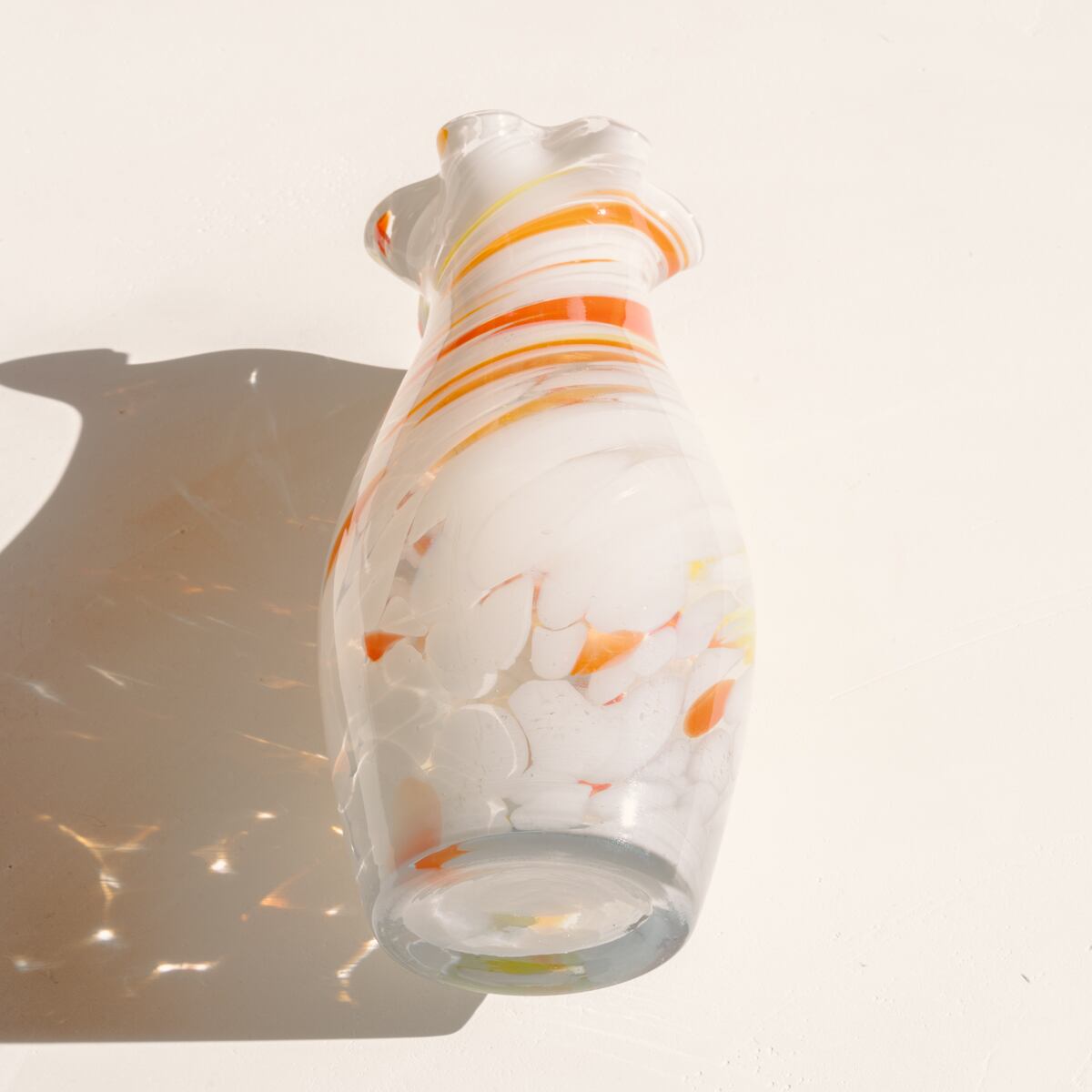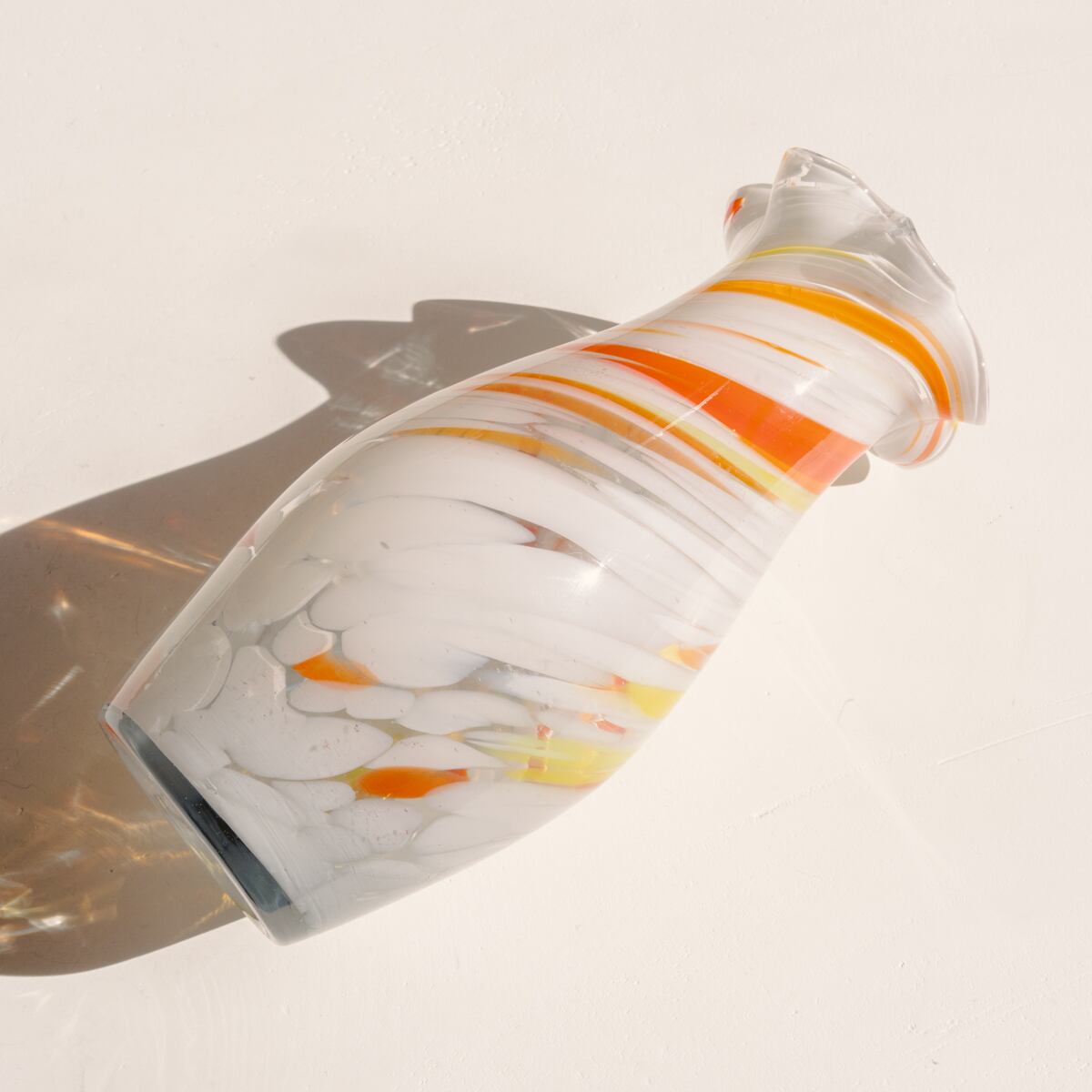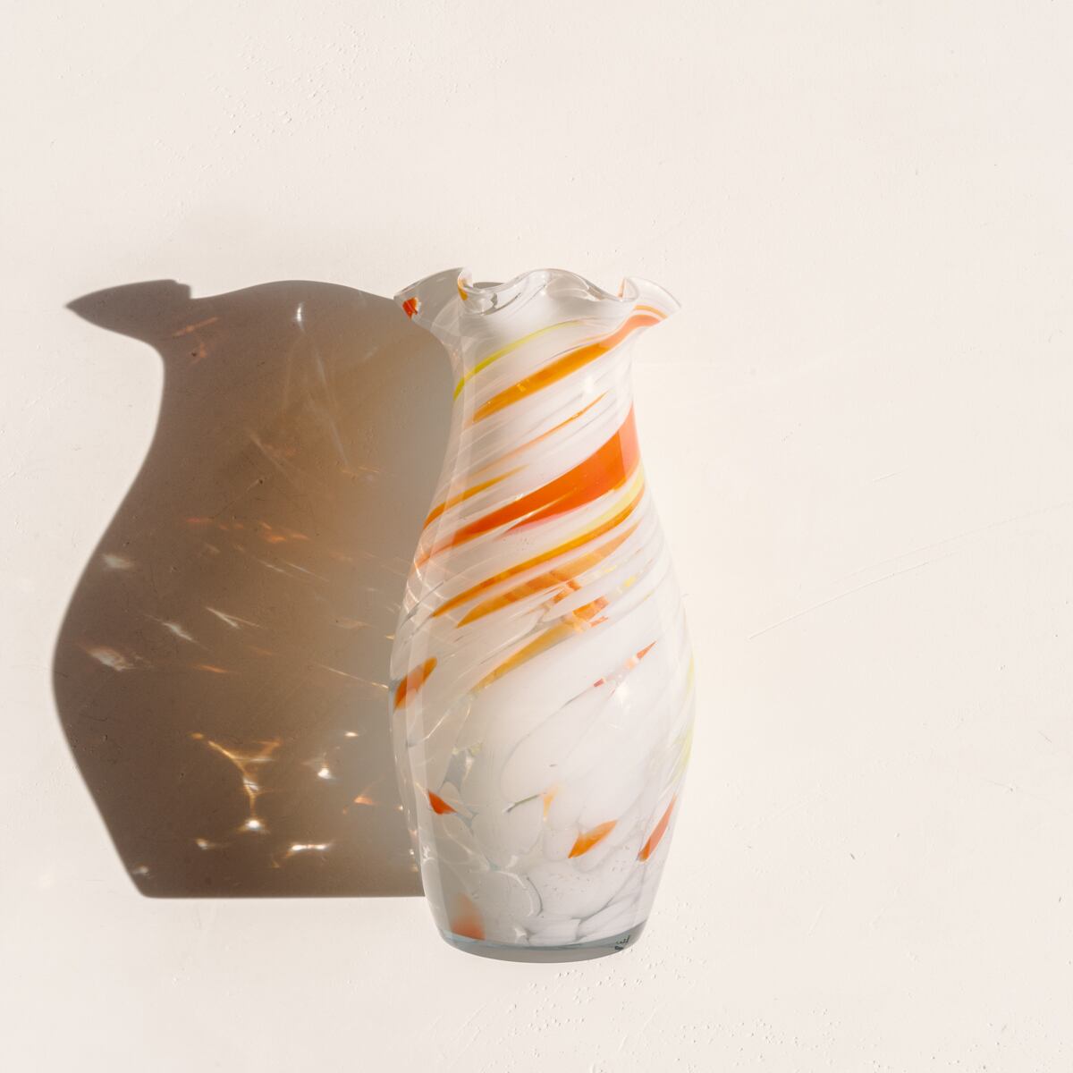 ホワイトをベースに、オレンジ、イエローの渦巻き模様で彩られています。