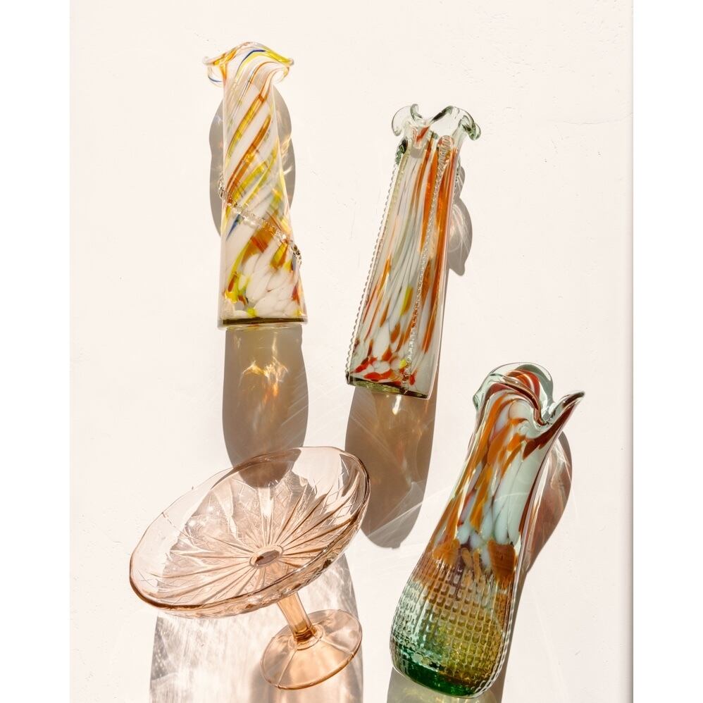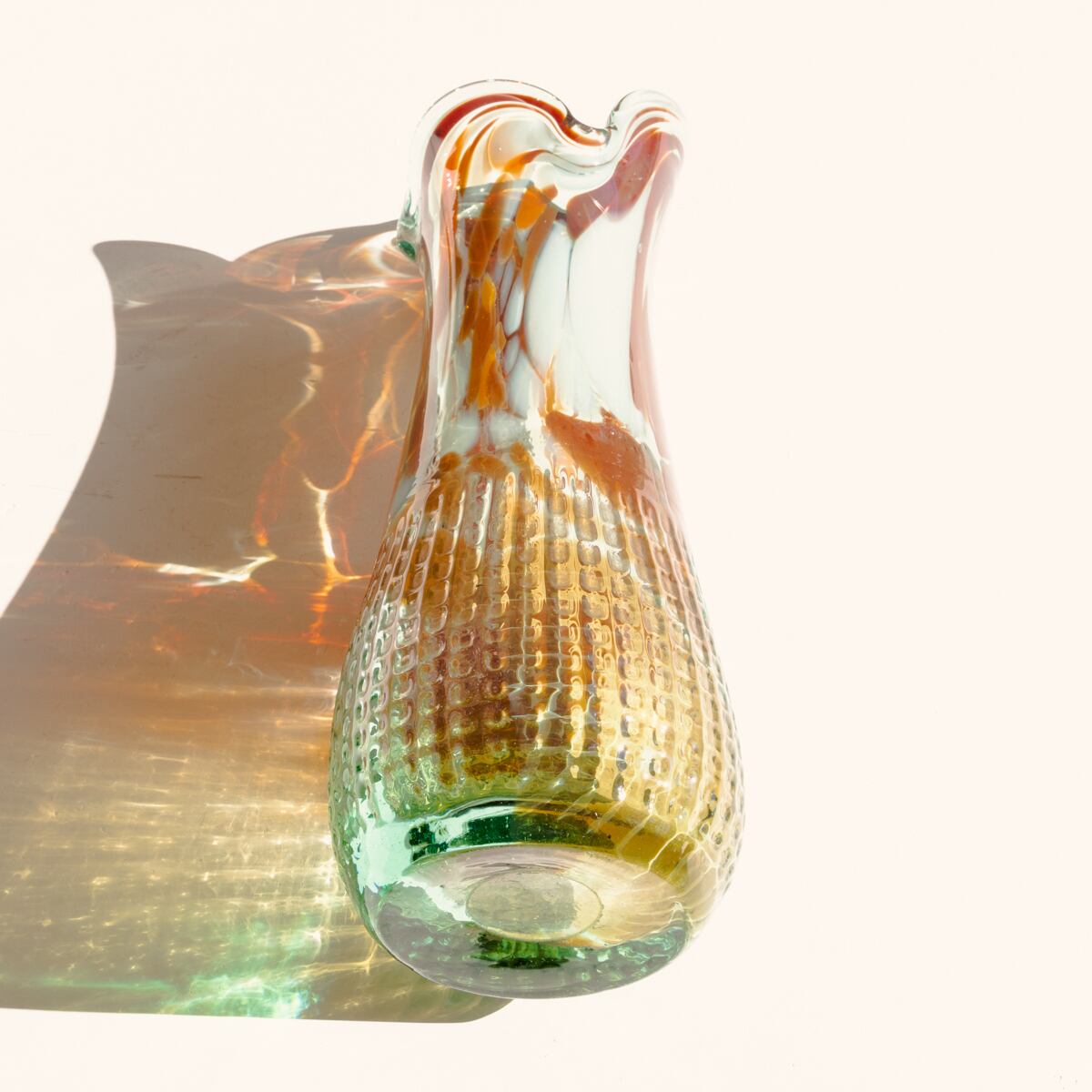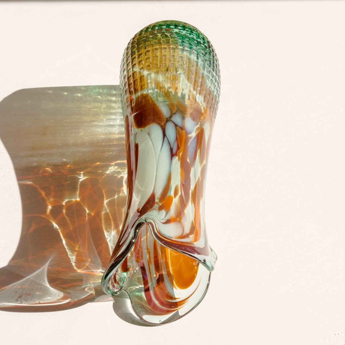 絶妙な色彩感覚で、グリーンがかったクリアガラスにオレンジ、ブラウン、ホワイトが入り混じり、キャンディーのようなマーブル模様に彩られています。