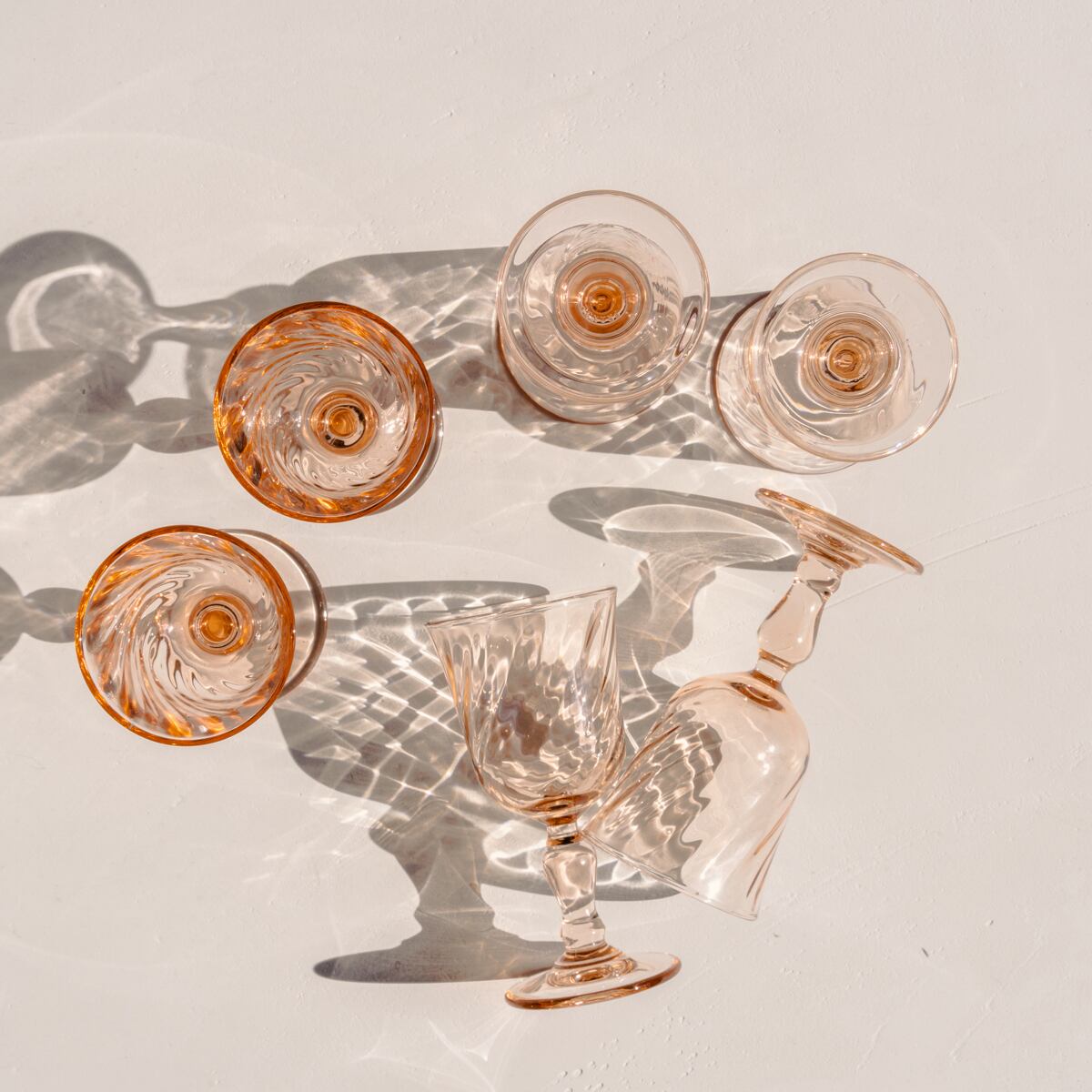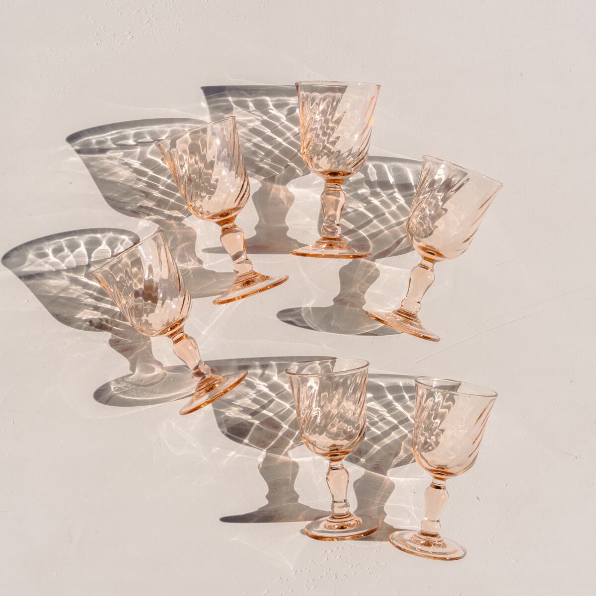 Luminarc製のグラスで、ガラスの渦巻くようなデザイン、柔らかいピンク色、透明感がとても美しいです。