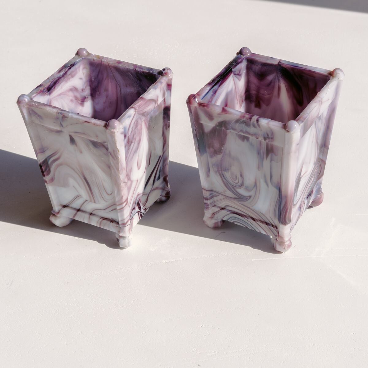 ホワイトとパープルのマーブル模様、とろみのあるミルキーな質感が美しい花器。