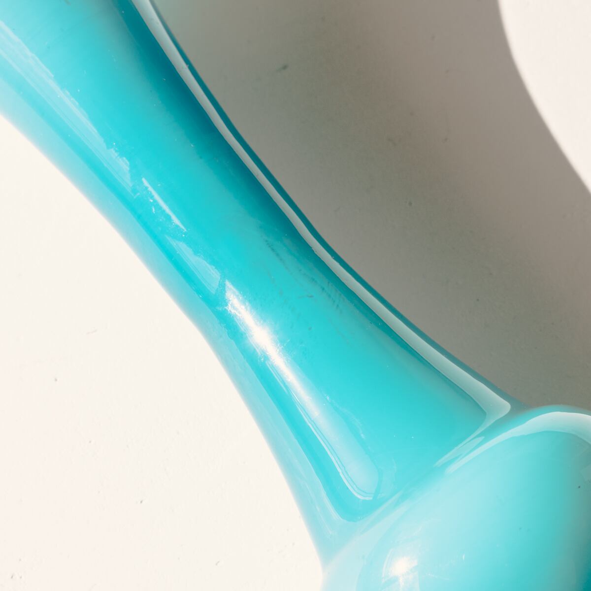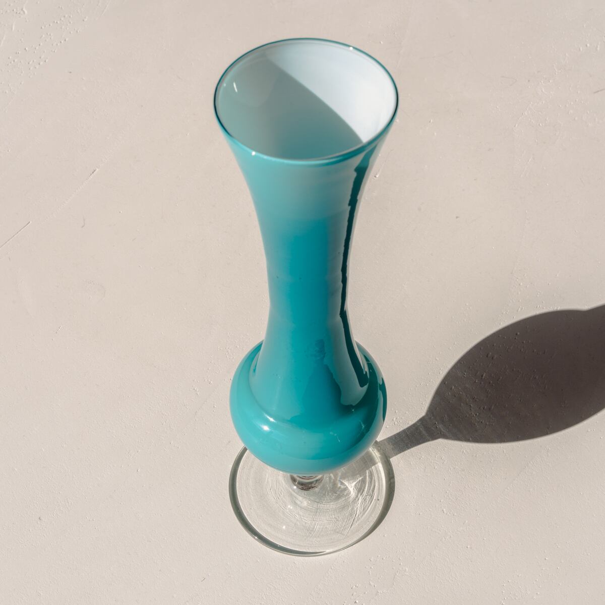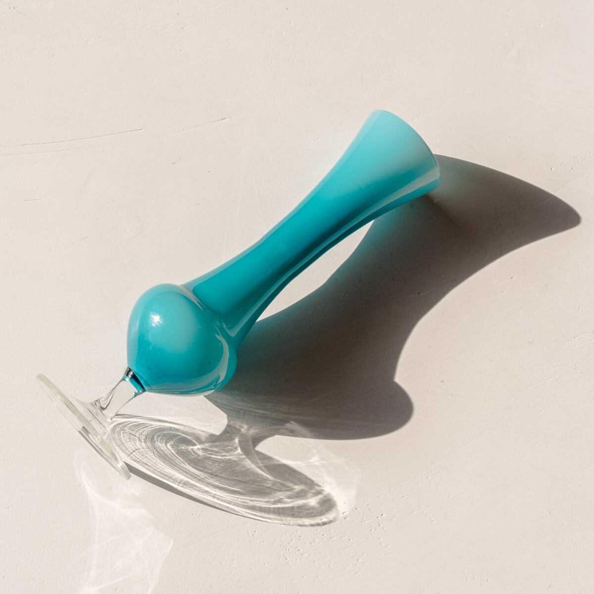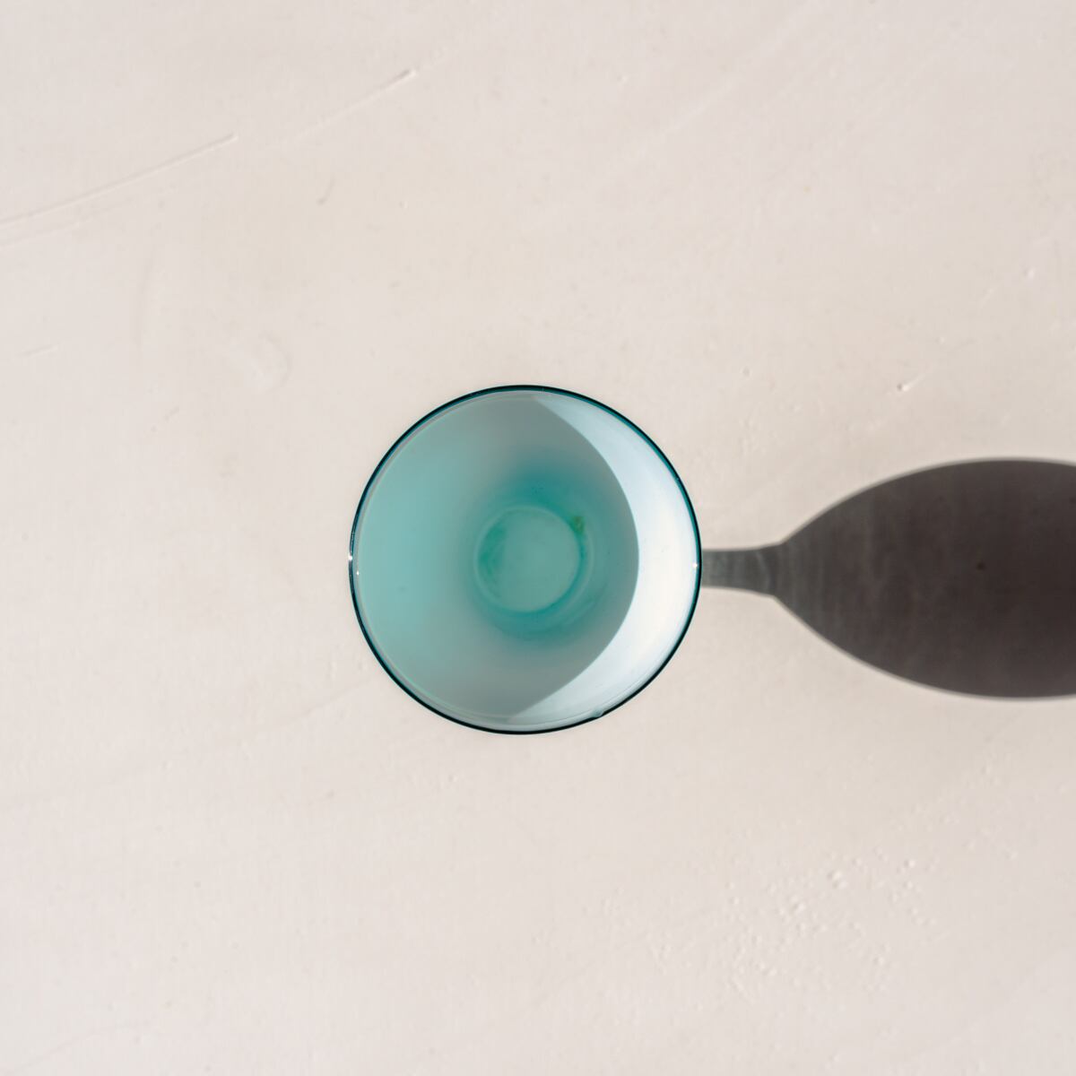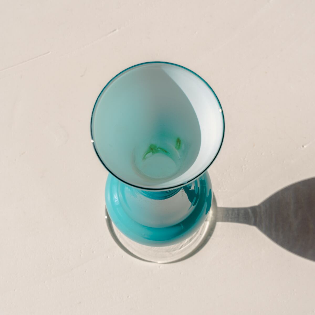 外側と内側でアクアブルーとホワイトのツートンカラー、足元はクリアガラスでつくられています。
