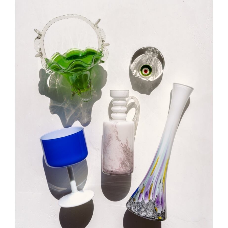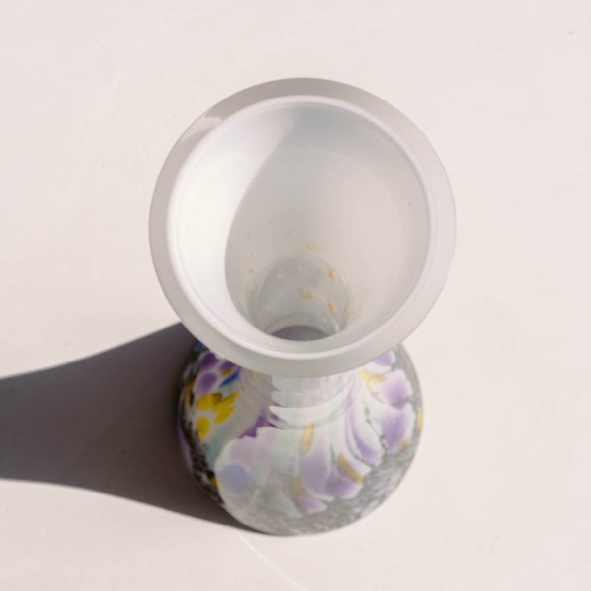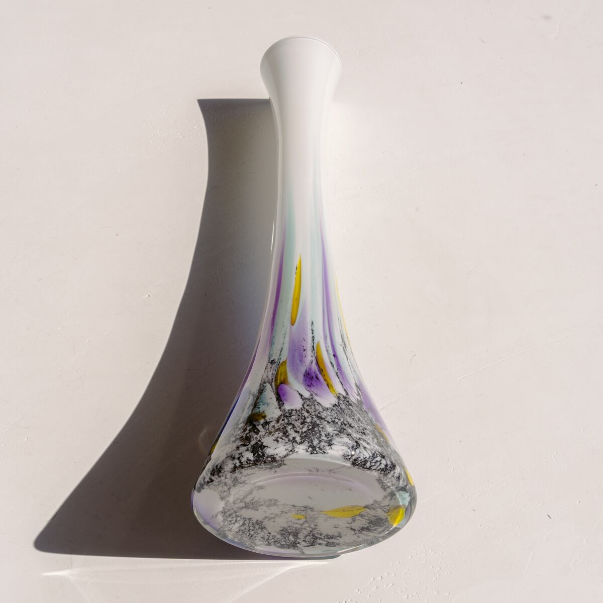 ホワイトをベースに、パープル、イエロー、ブルーが入り混じった、絶妙な色彩感覚が美しい花器。
