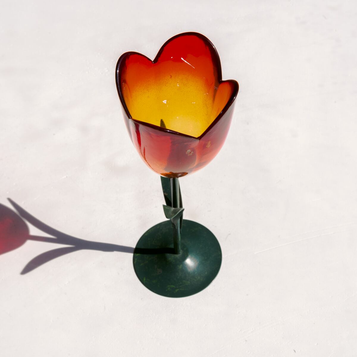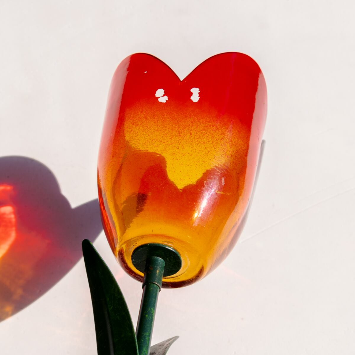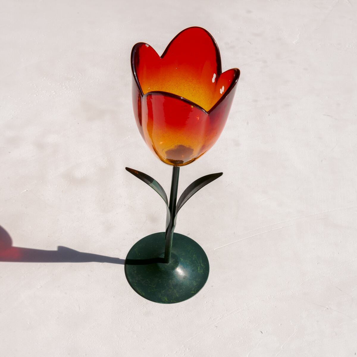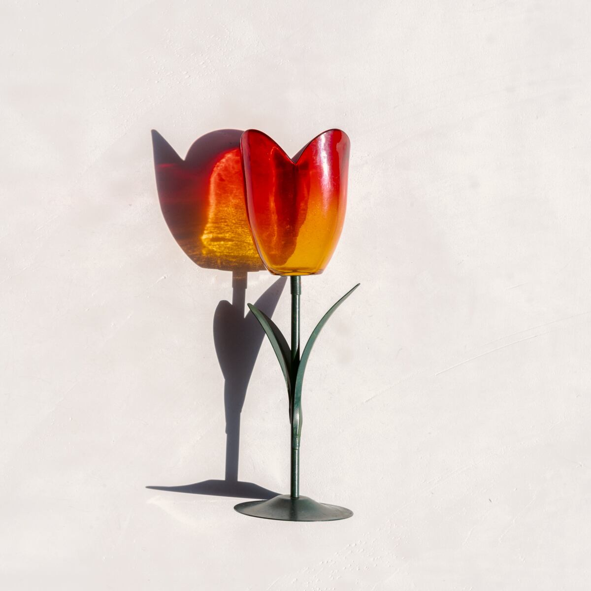 チューリップをモチーフに、花はオレンジレッドが美しいグラデーションの塗装ガラス、葉のついた茎は金属で表現されています。