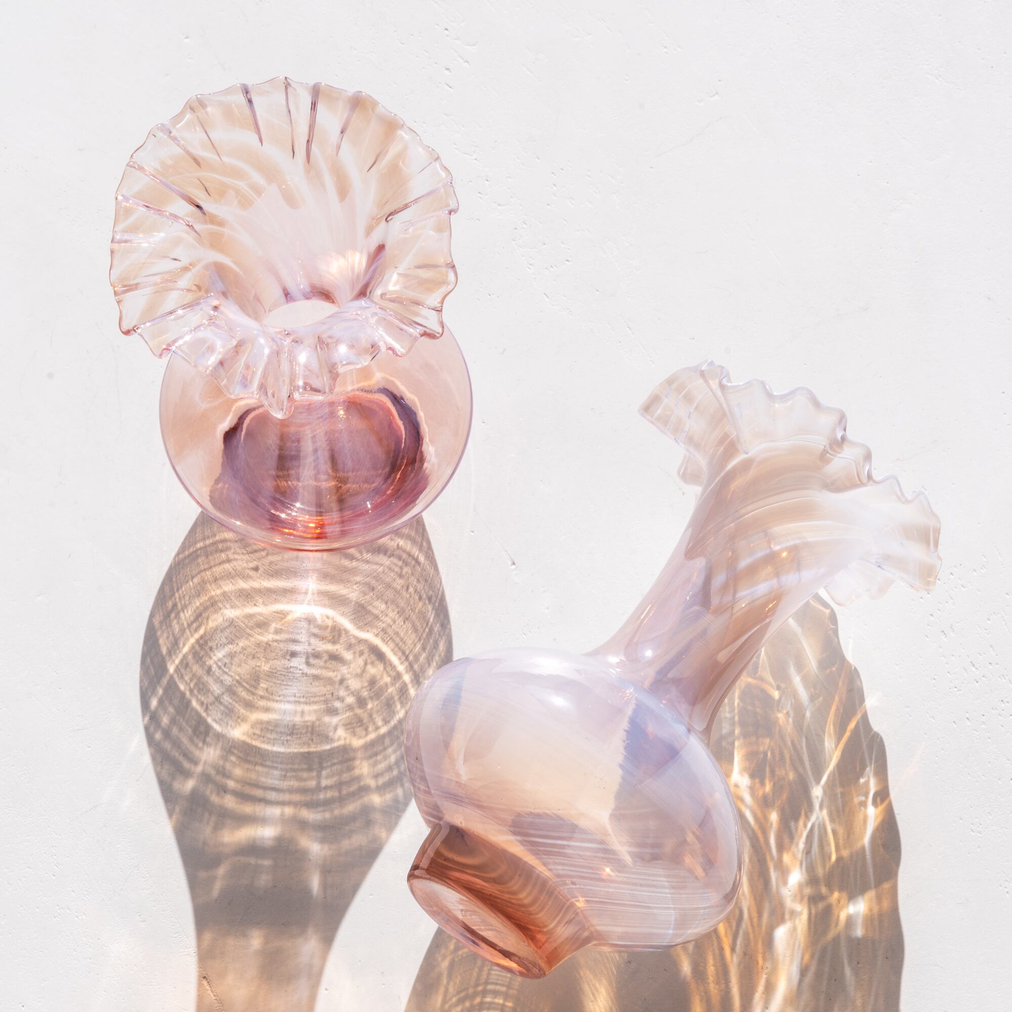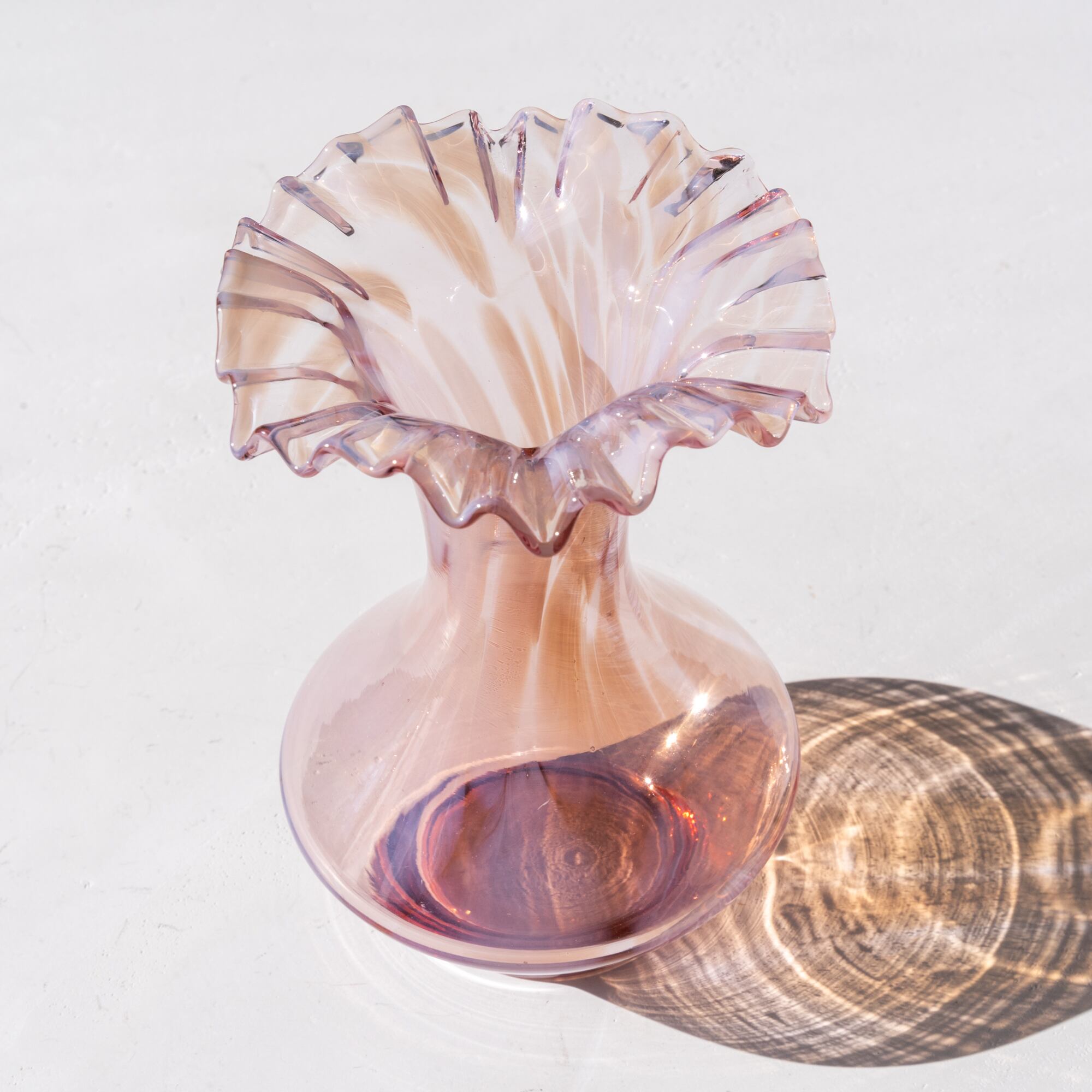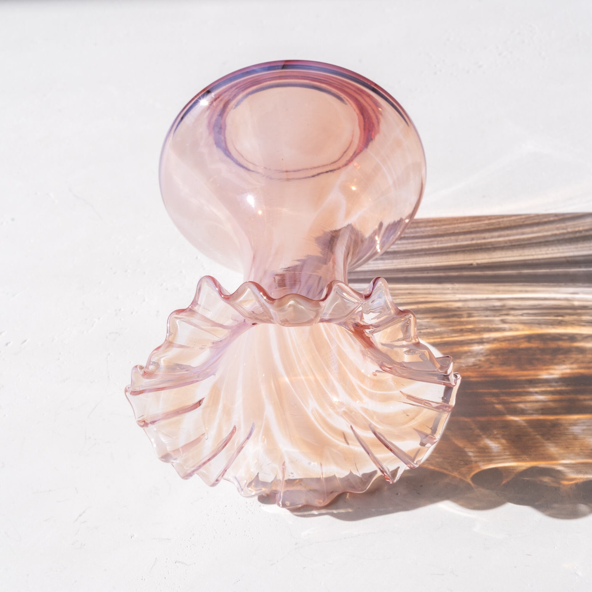 ピンクがかったクリアなガラスに、ホワイトのマーブル模様が広がる美しいデザイン。
