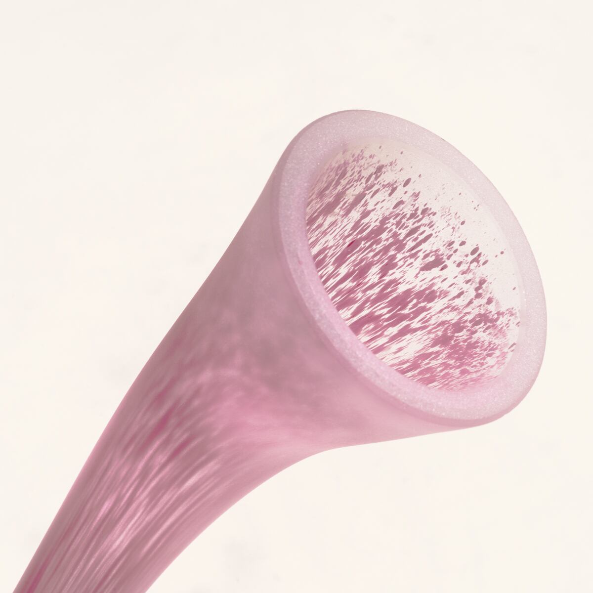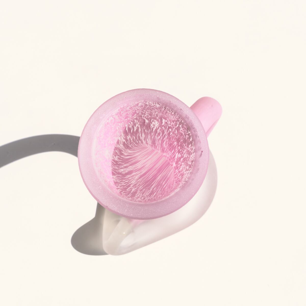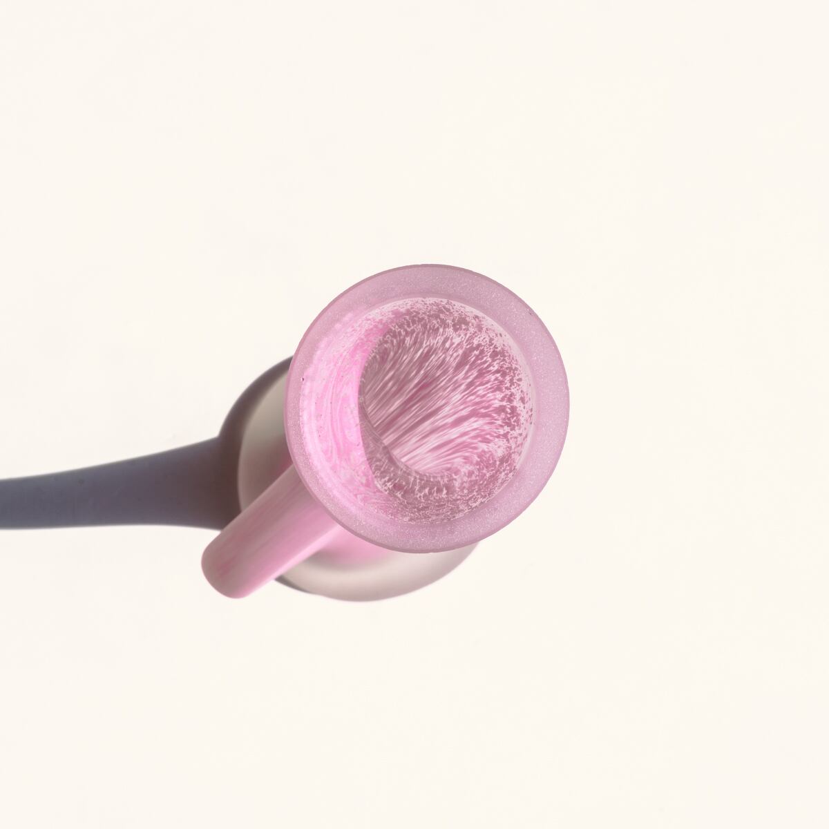 マットなクリアガラスに、ピンクのマーブル模様が広がっています。