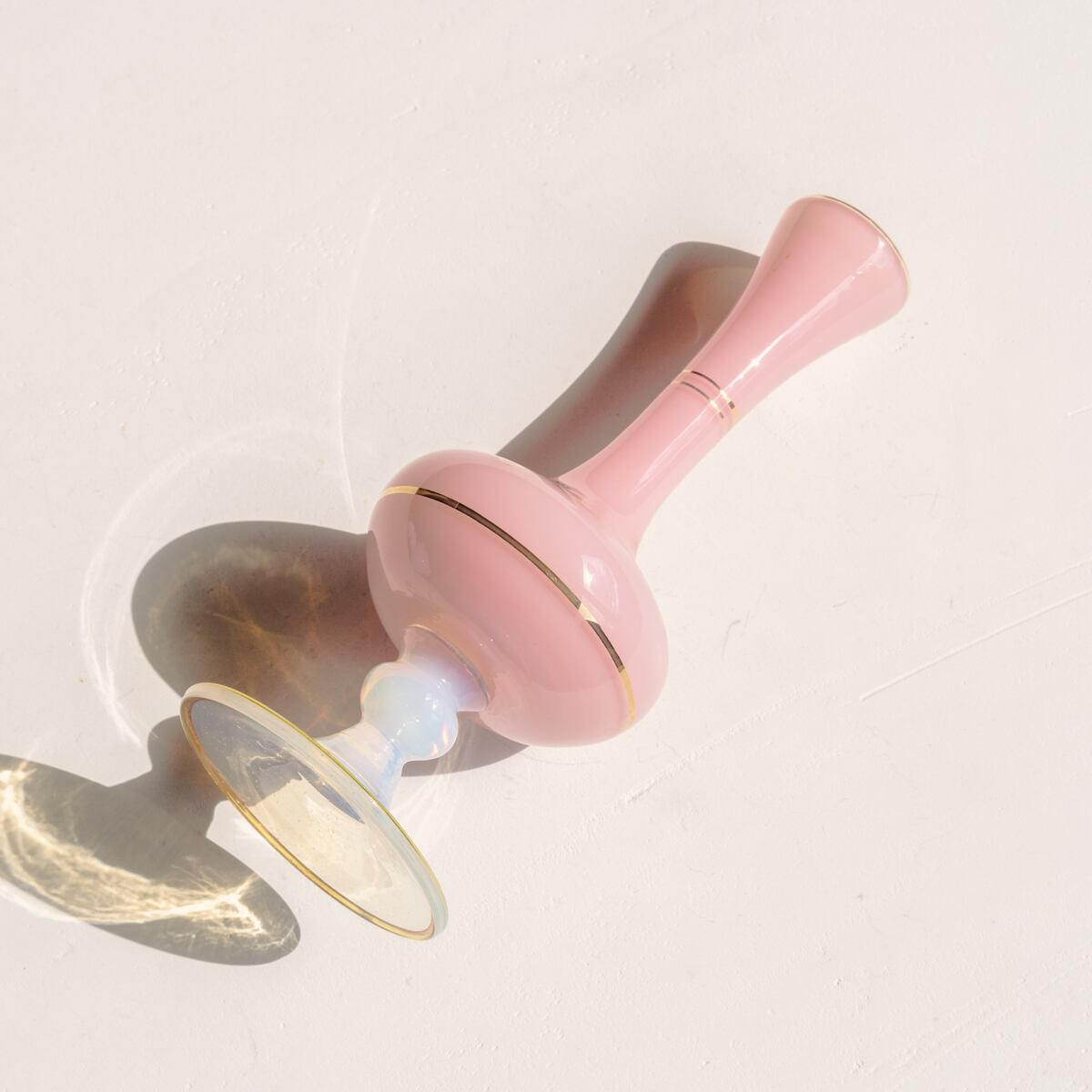淡いピンクと足元のホワイトのツートンカラーで、花やゴールドの装飾がほどこされています。