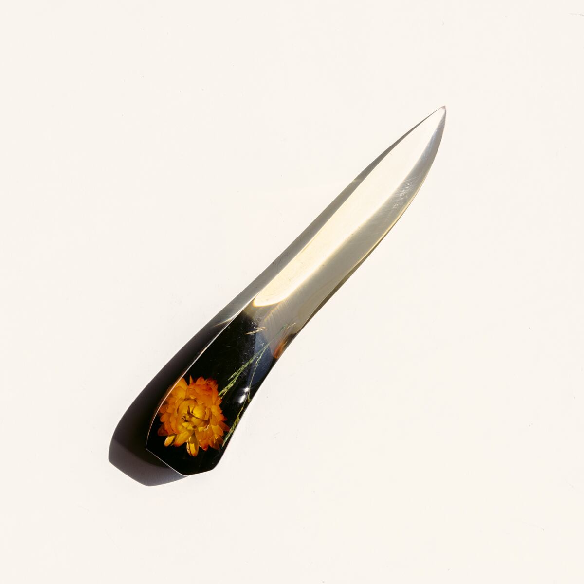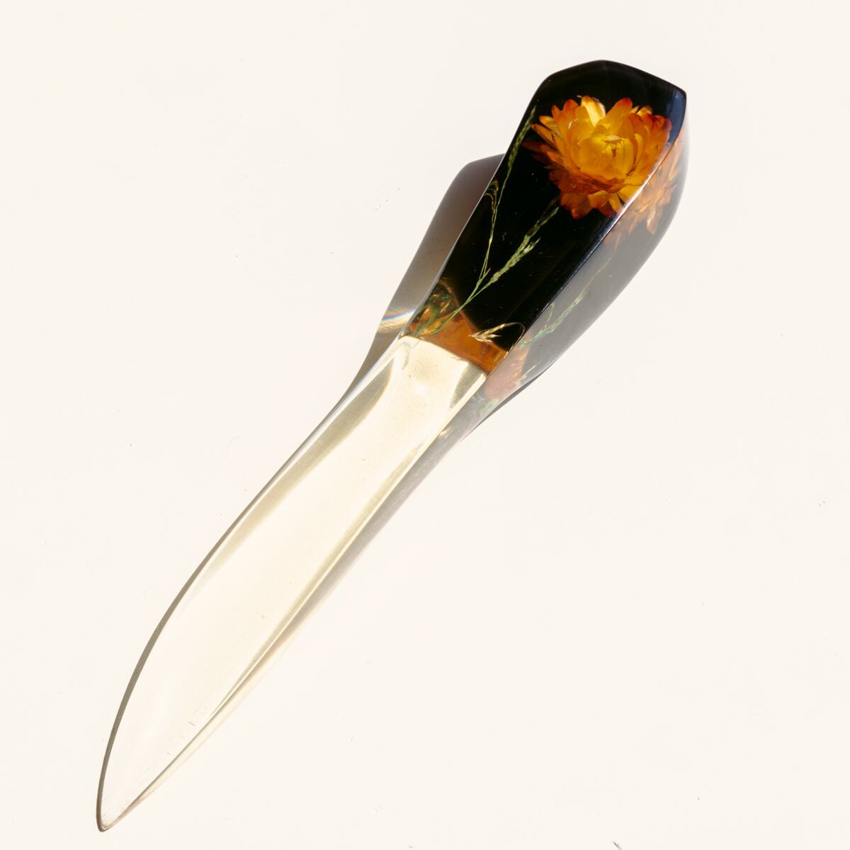 オレンジ色の花を閉じ込めた樹脂製のレターオープナーです。