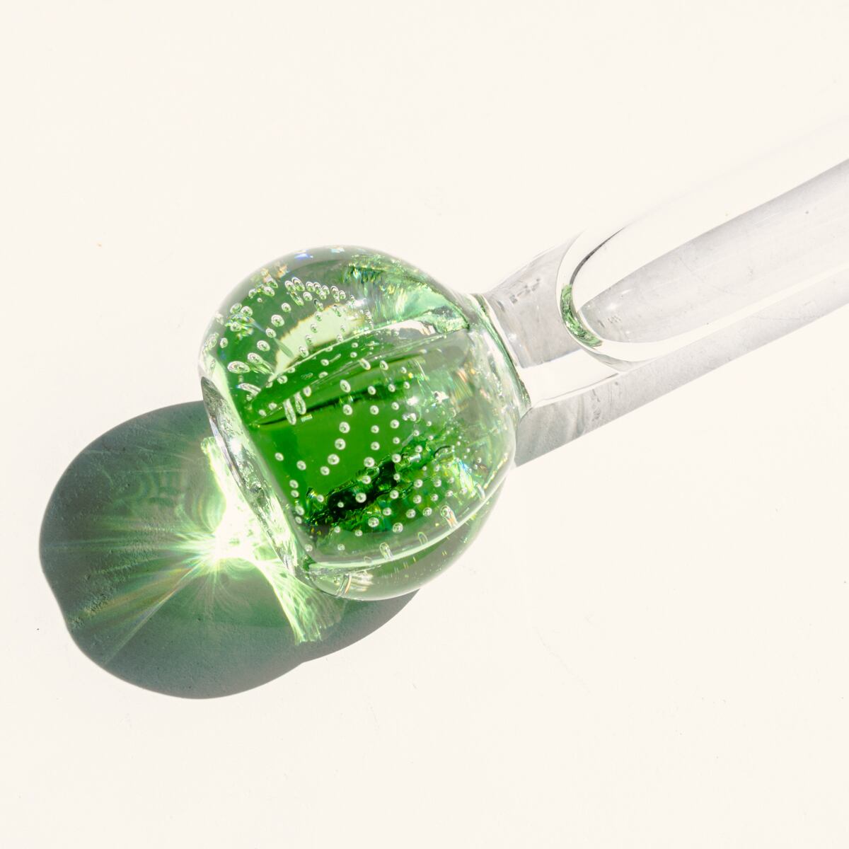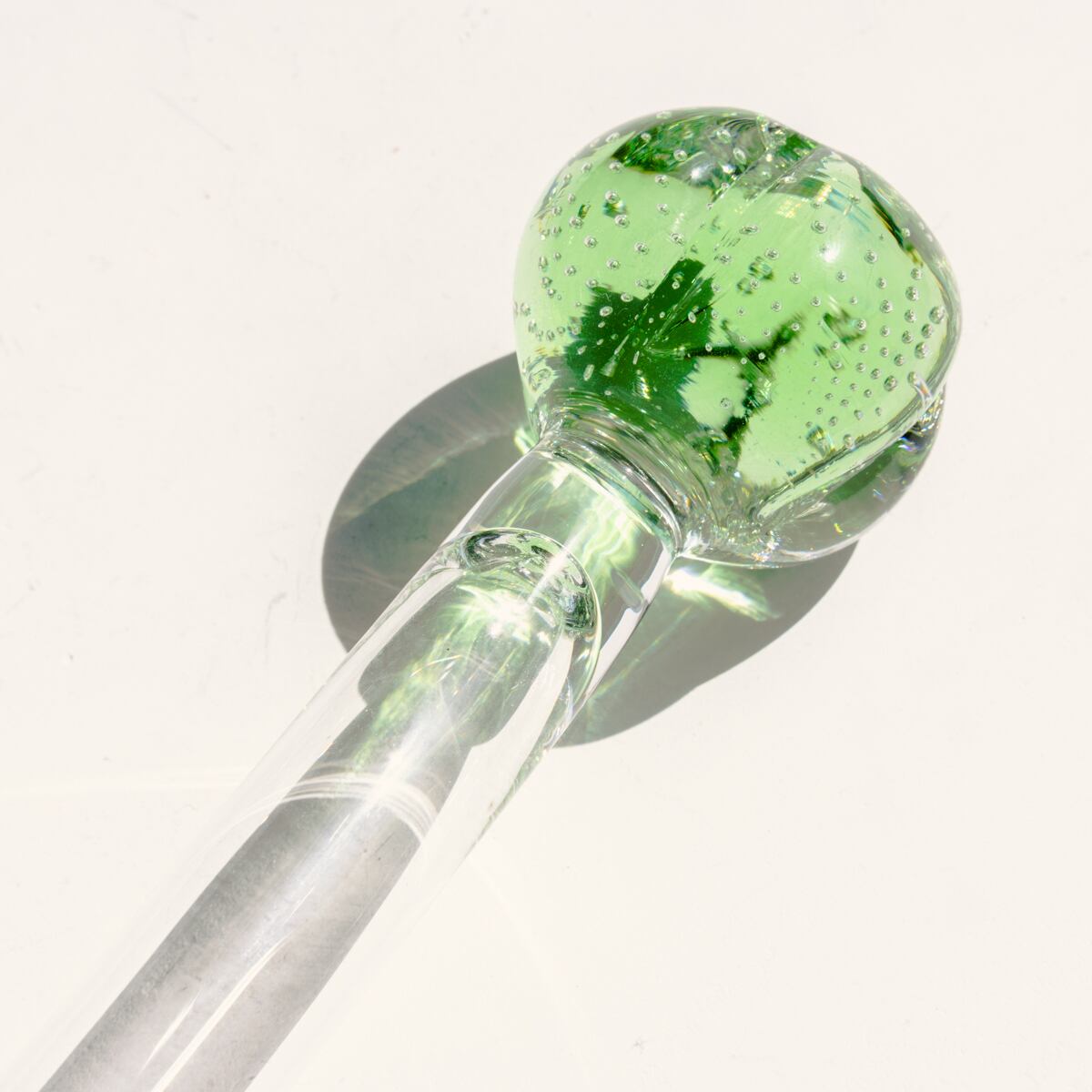 筒部分はスリムな一輪挿し、ボール部分はバブル(気泡)の入ったガラスでできており、ぽってりとしたデザイン。