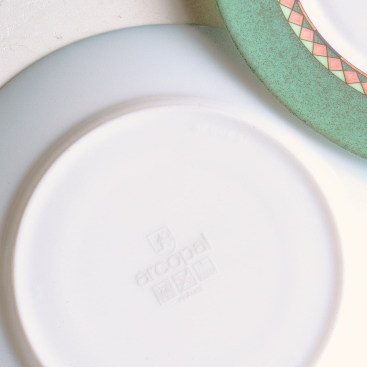 状態の良いarcopal社製の美しいプレートで、裏面に「arcopal France」と刻印があります。