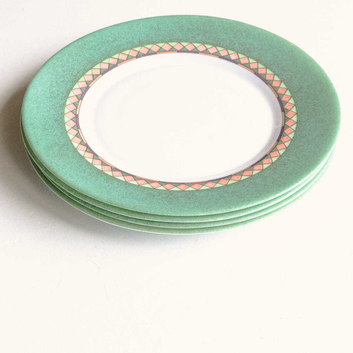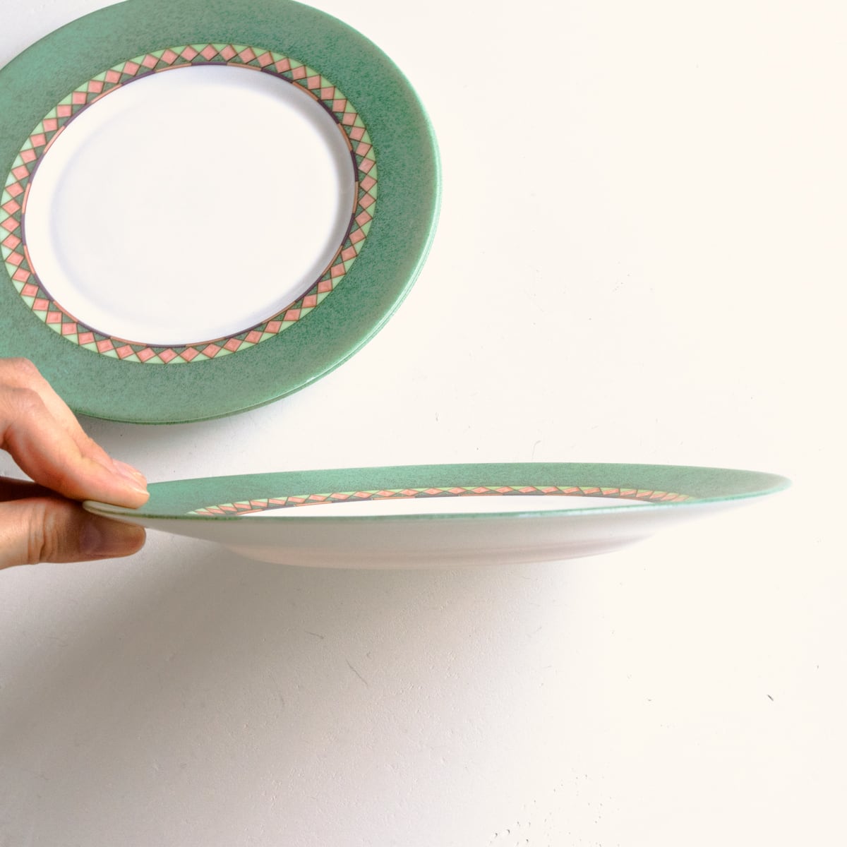 ミントグリーンとピンクの色味、幾何学模様、とろみのあるミルキーな質感が魅力的なアイテム。