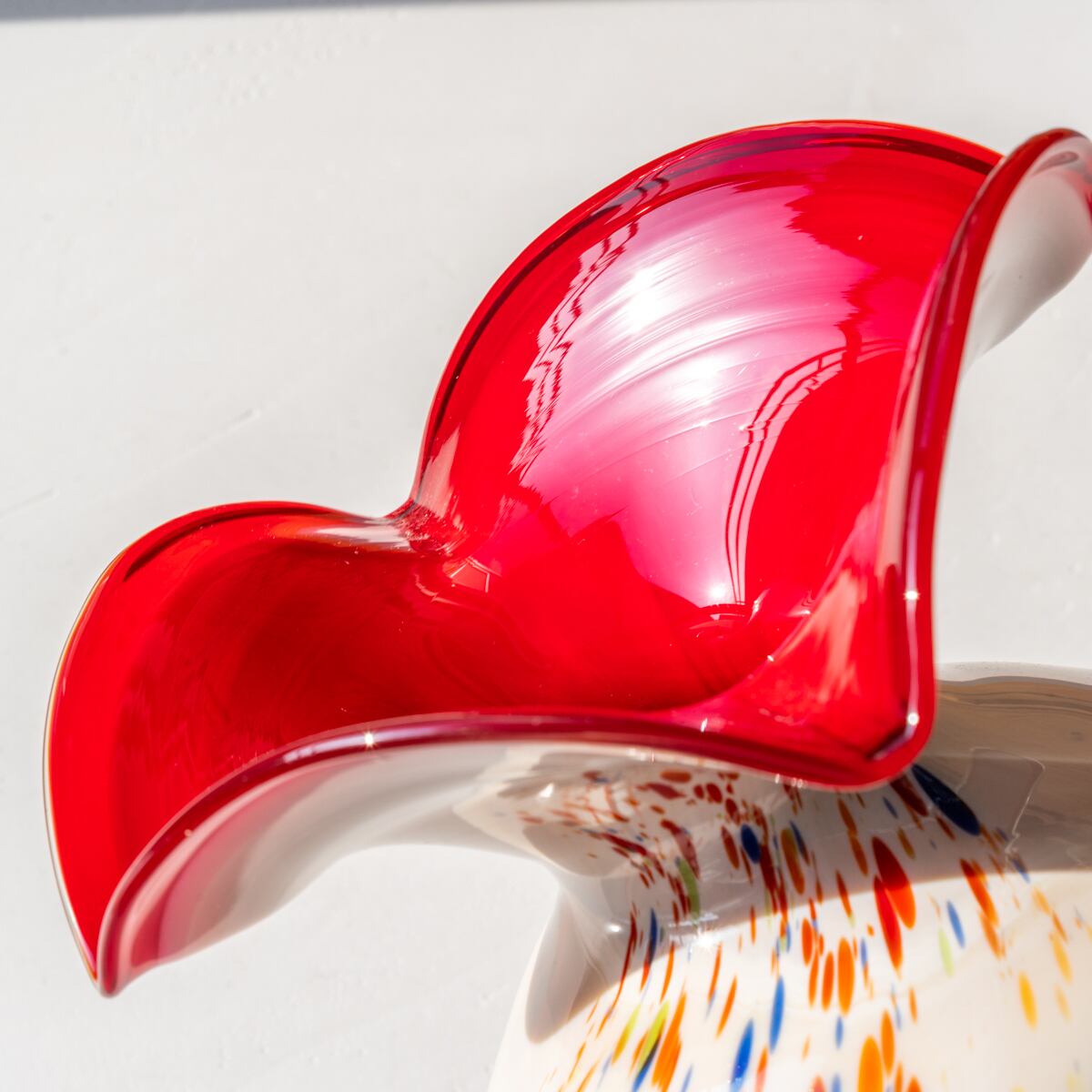 花器内側は印象的なレッドの色味、縁はフリルのデザインがアクセントになっています。