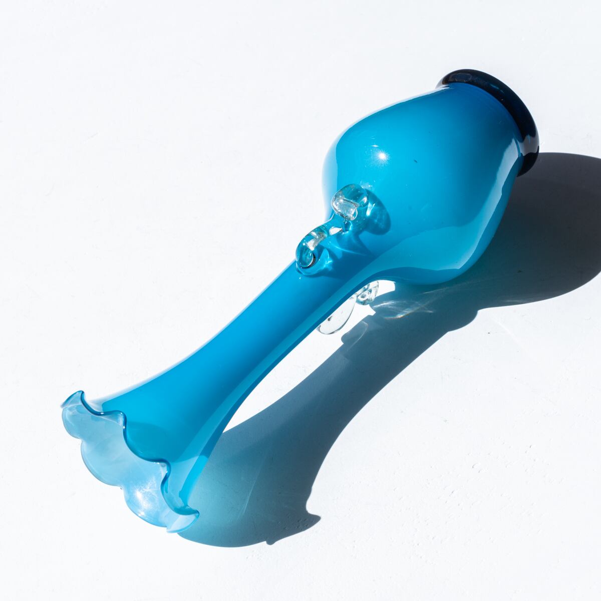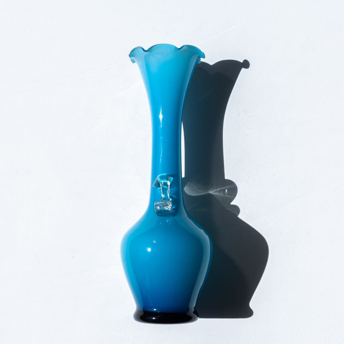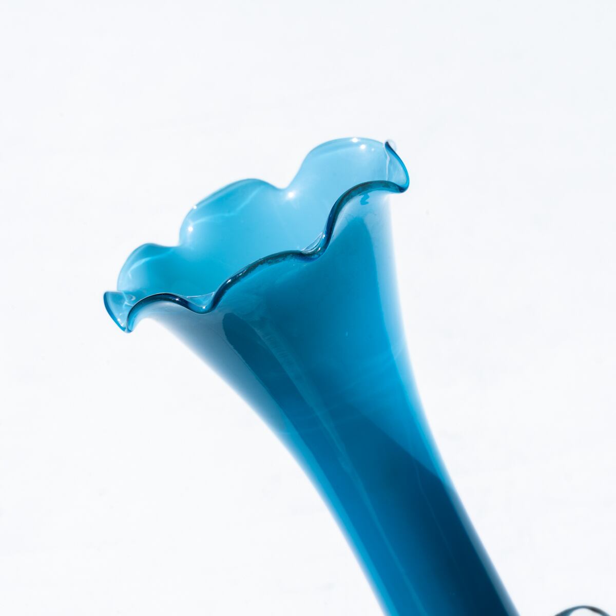 フリルの縁や小さなクリアガラスの装飾など、こだわりの詰まった花器です。