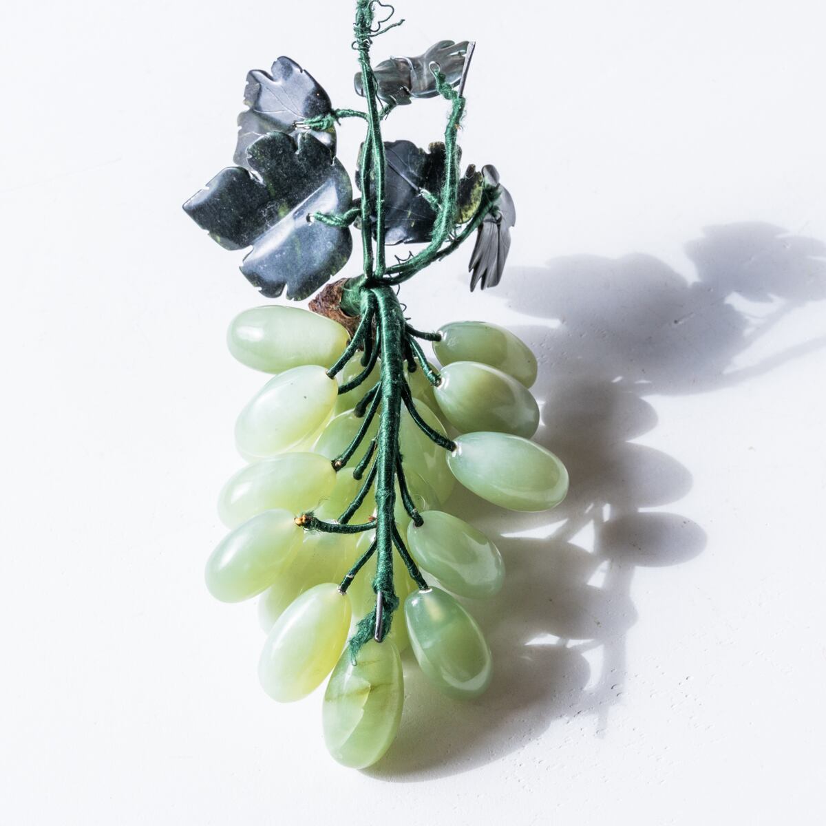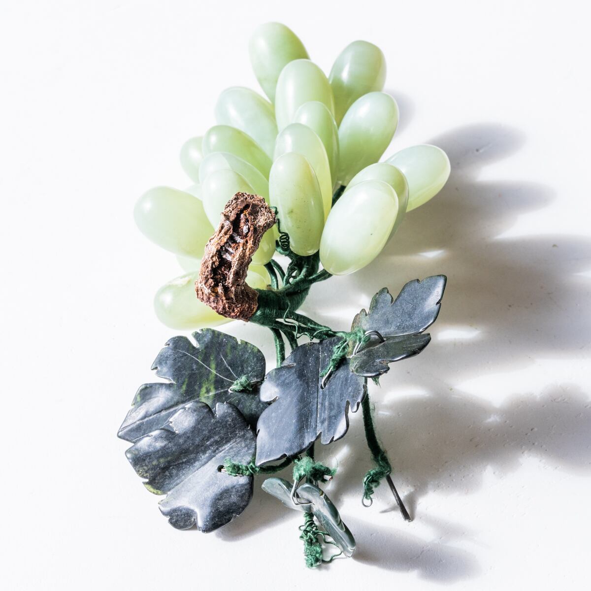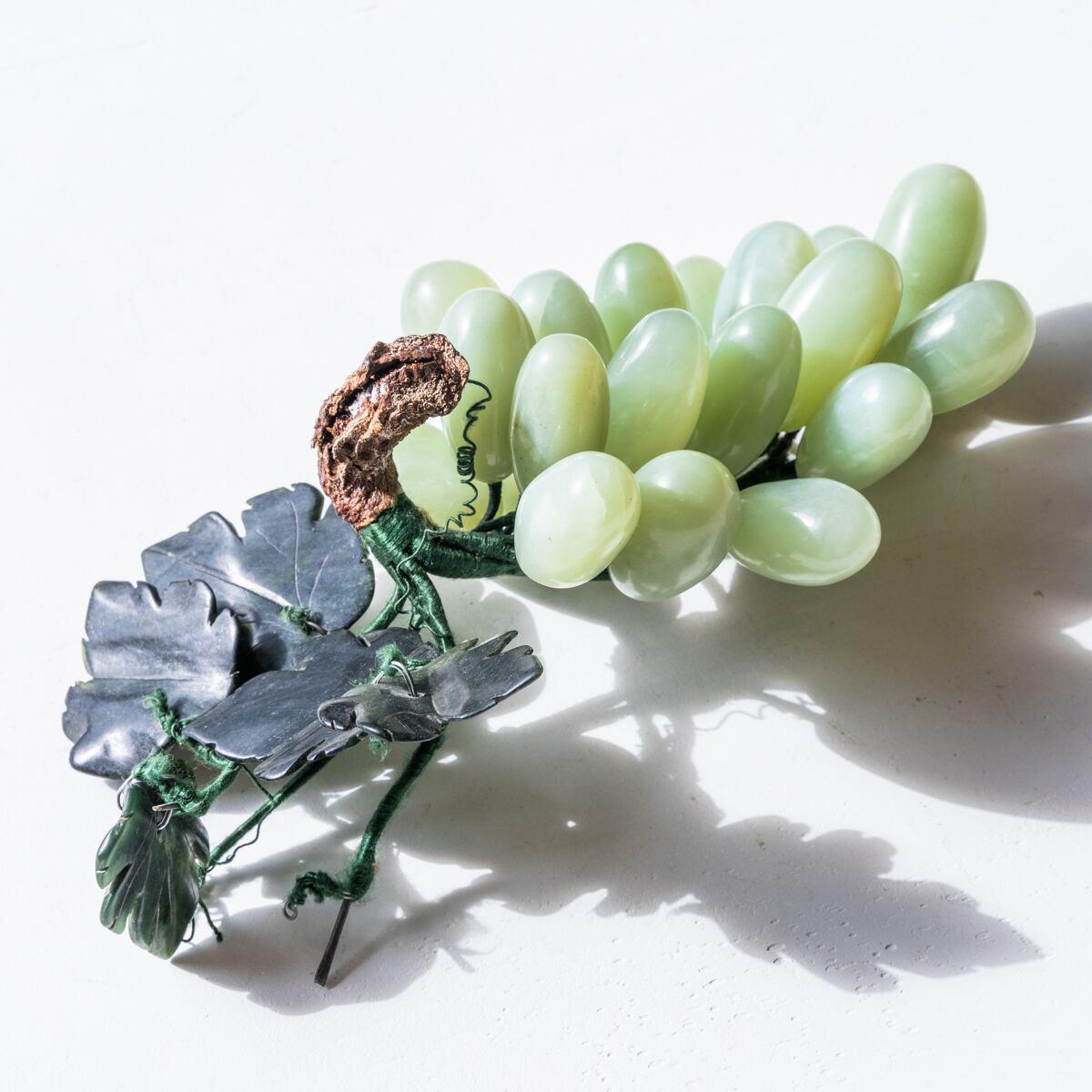 葡萄の粒は翡翠(ヒスイ)の美しさを生かしてみずみずしく表現され、グリーンの葉は葉脈も表情まで彫り込まれています。