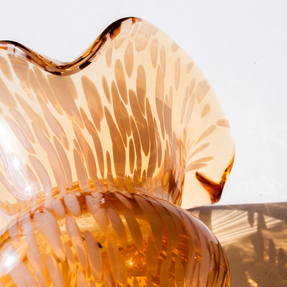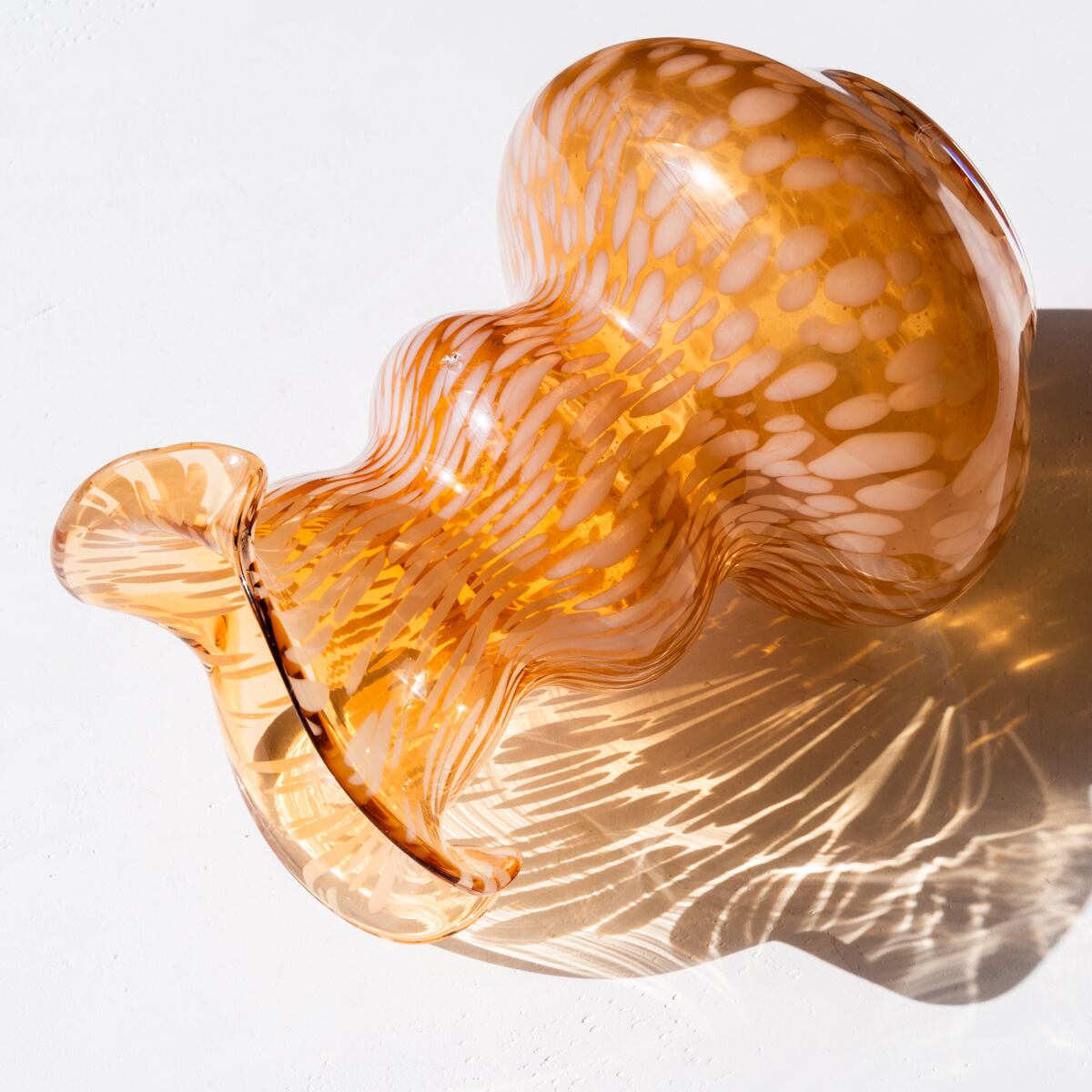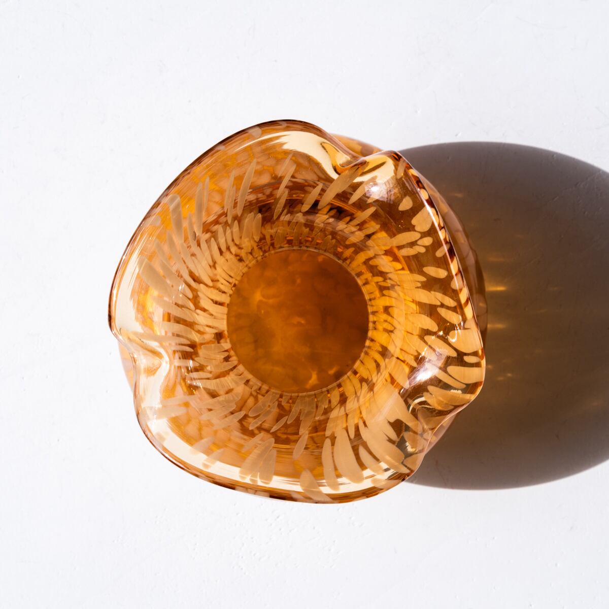 アンバー色のガラスに、ホワイトの模様が広がる美しいデザイン。