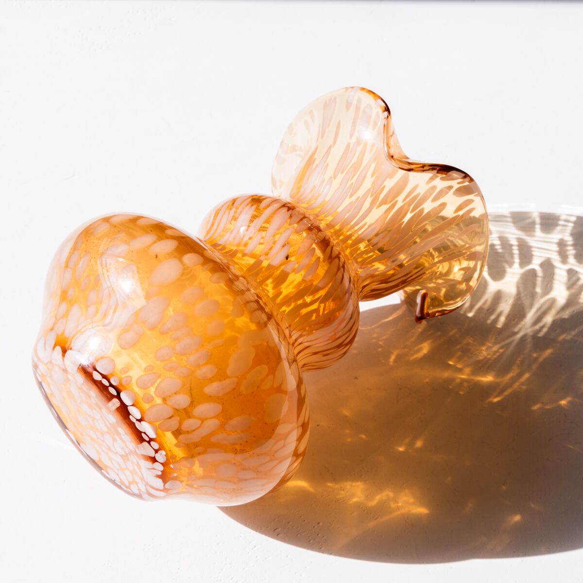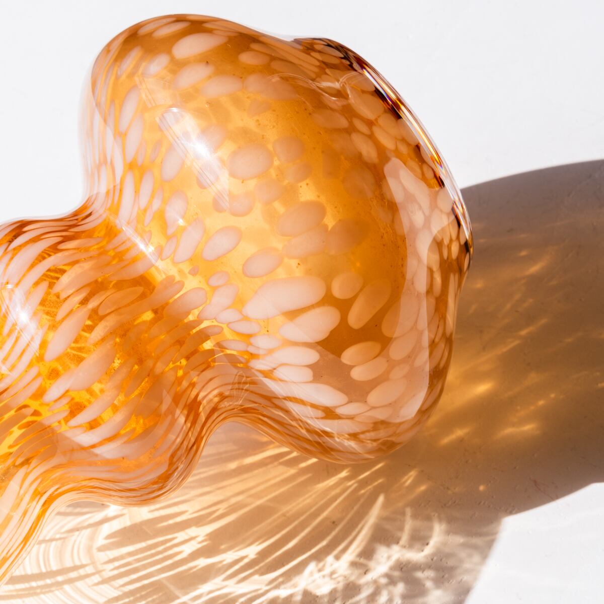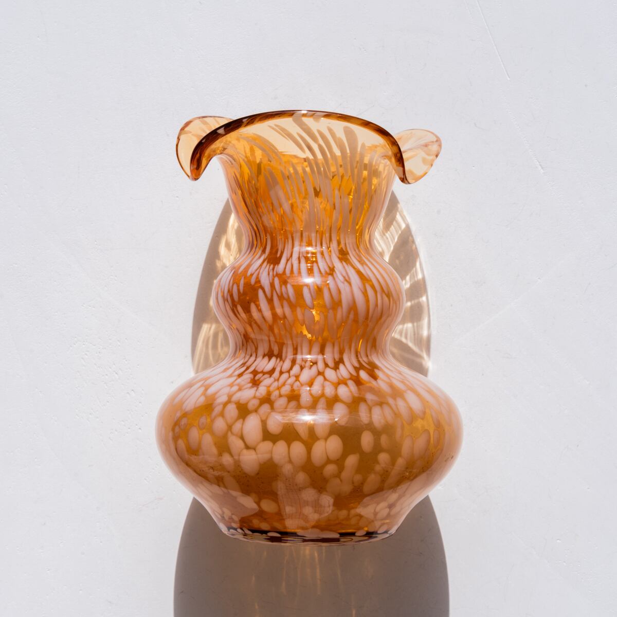 アンバー色のガラスに、ホワイトの模様が広がる美しいデザイン。