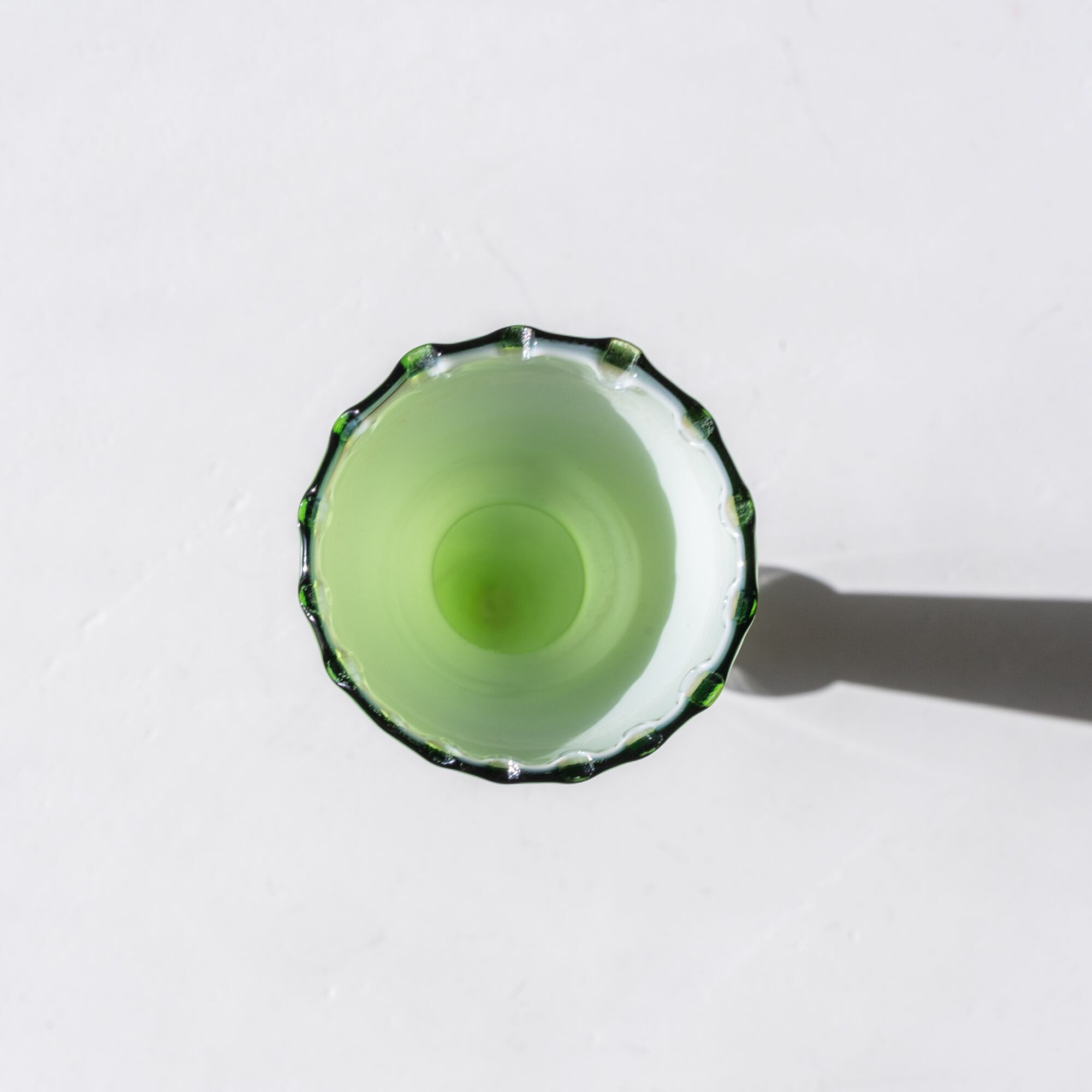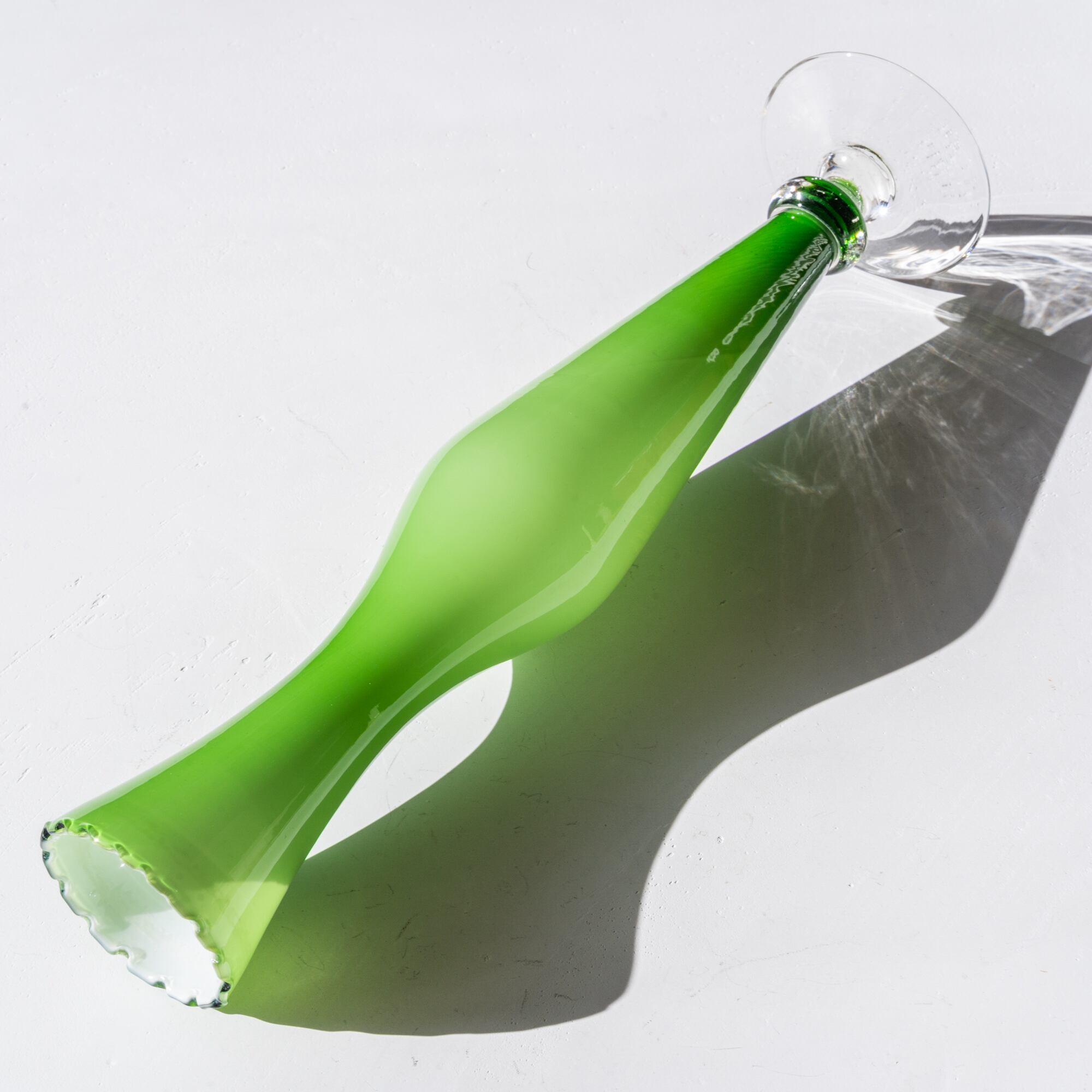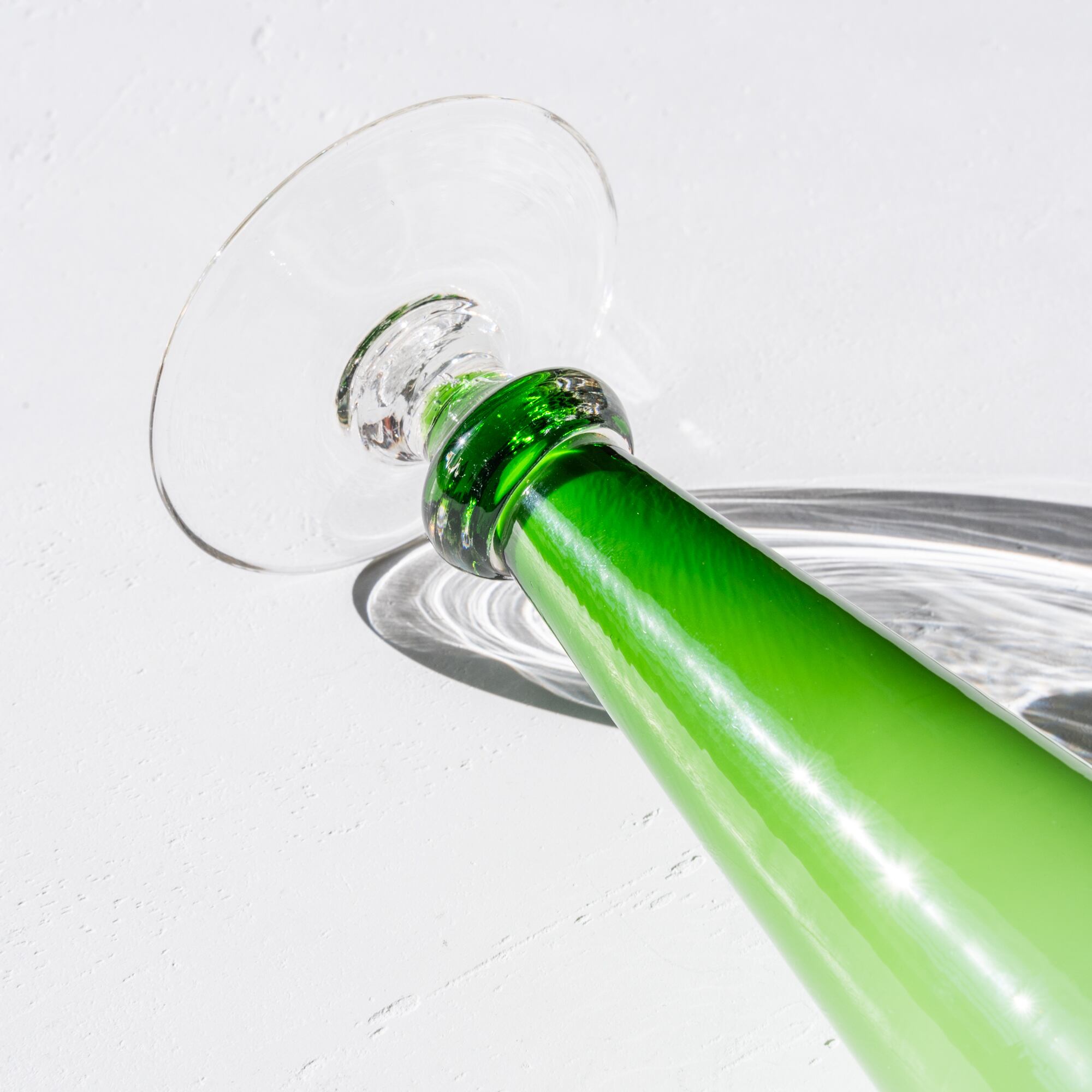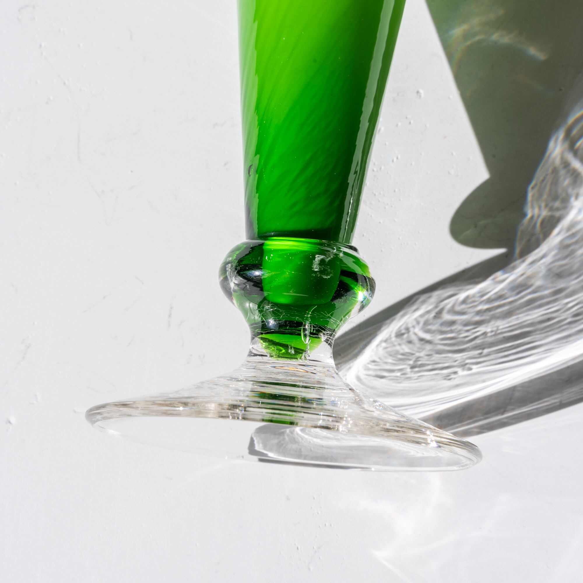 ミルキーなエメラルドグリーンとなめらかな質感が絶妙で、クリアガラスの部分の装飾も素晴らしいミッドセンチュリーな作品。
