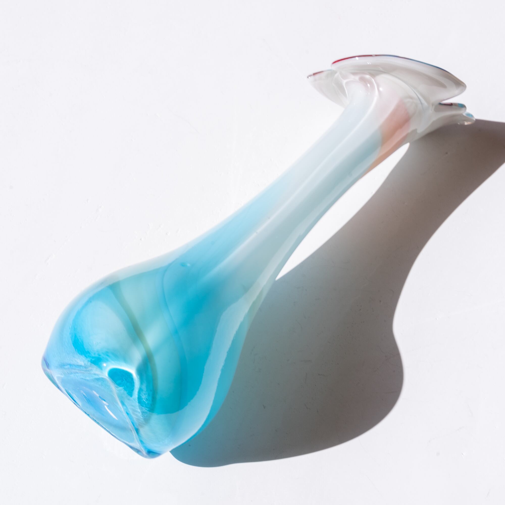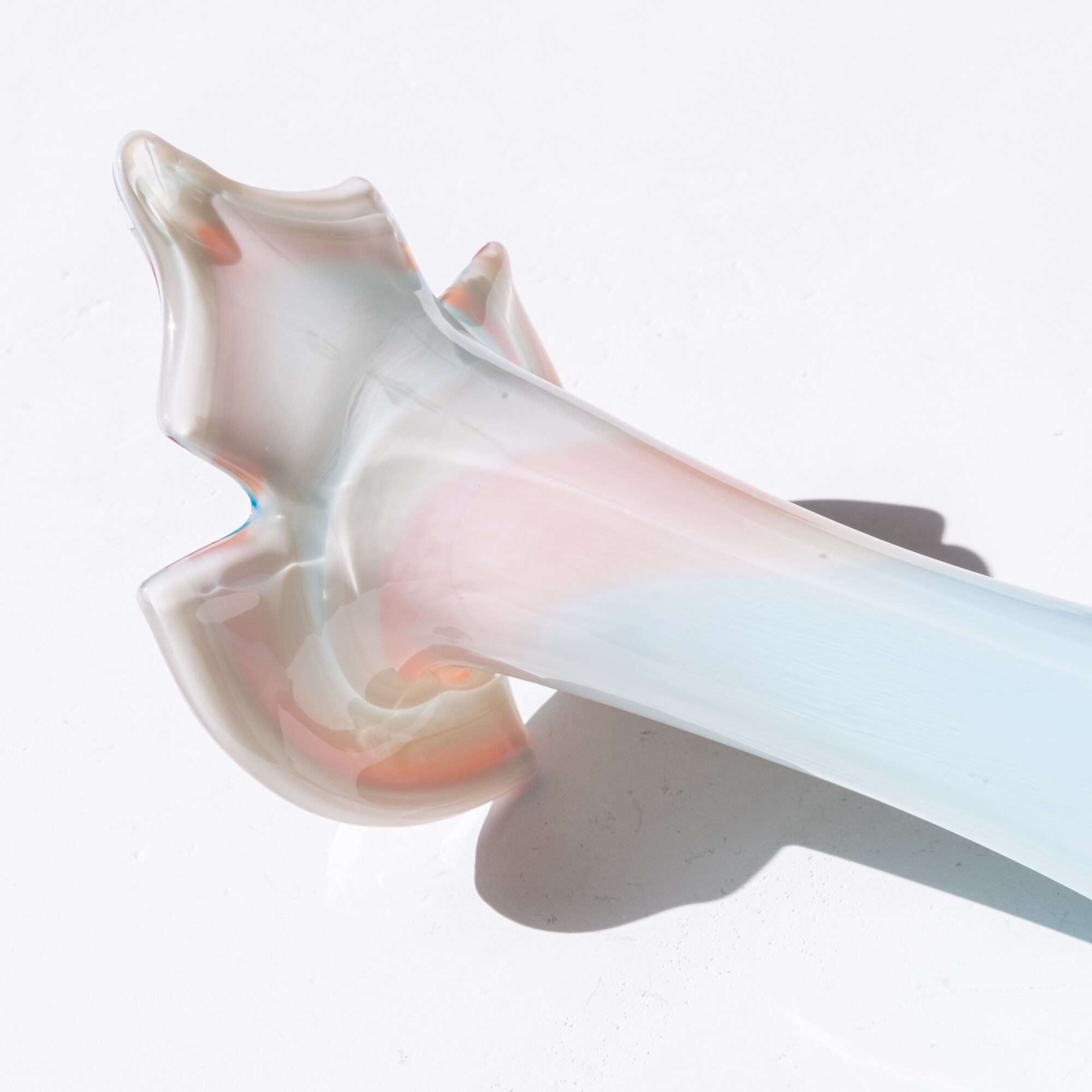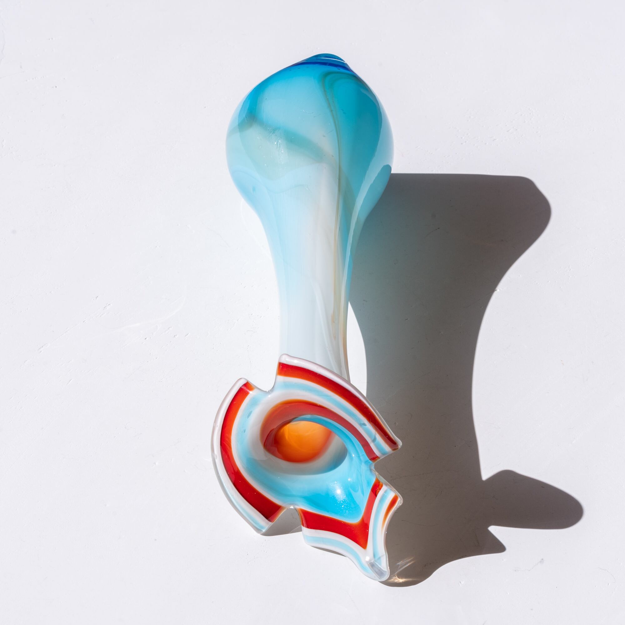 空に広がる雲を描いたようなブルーとホワイトのグラデーション、エッジの効いた口元のデザインや、レッドのアクセントが効いた個性的なガラスアート。