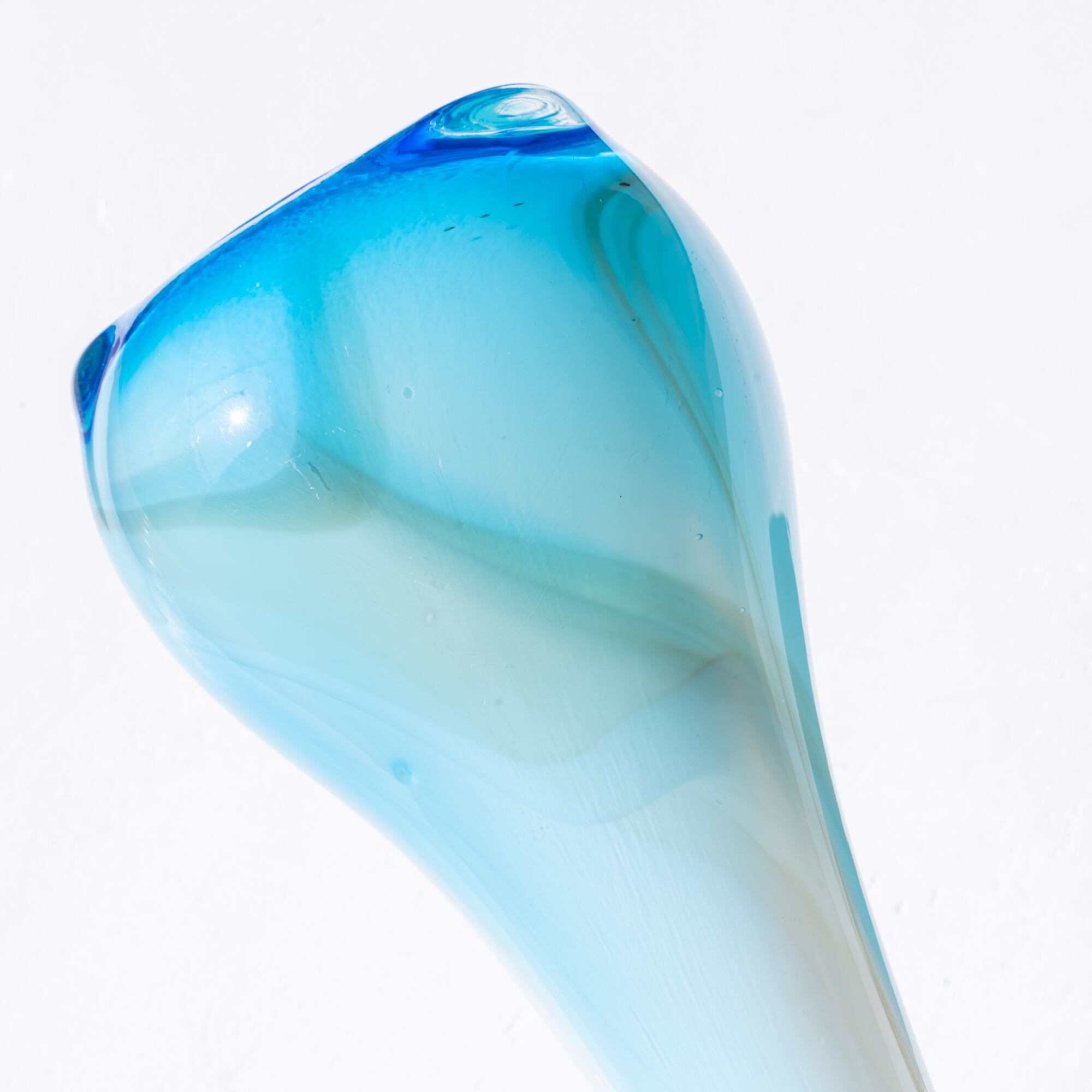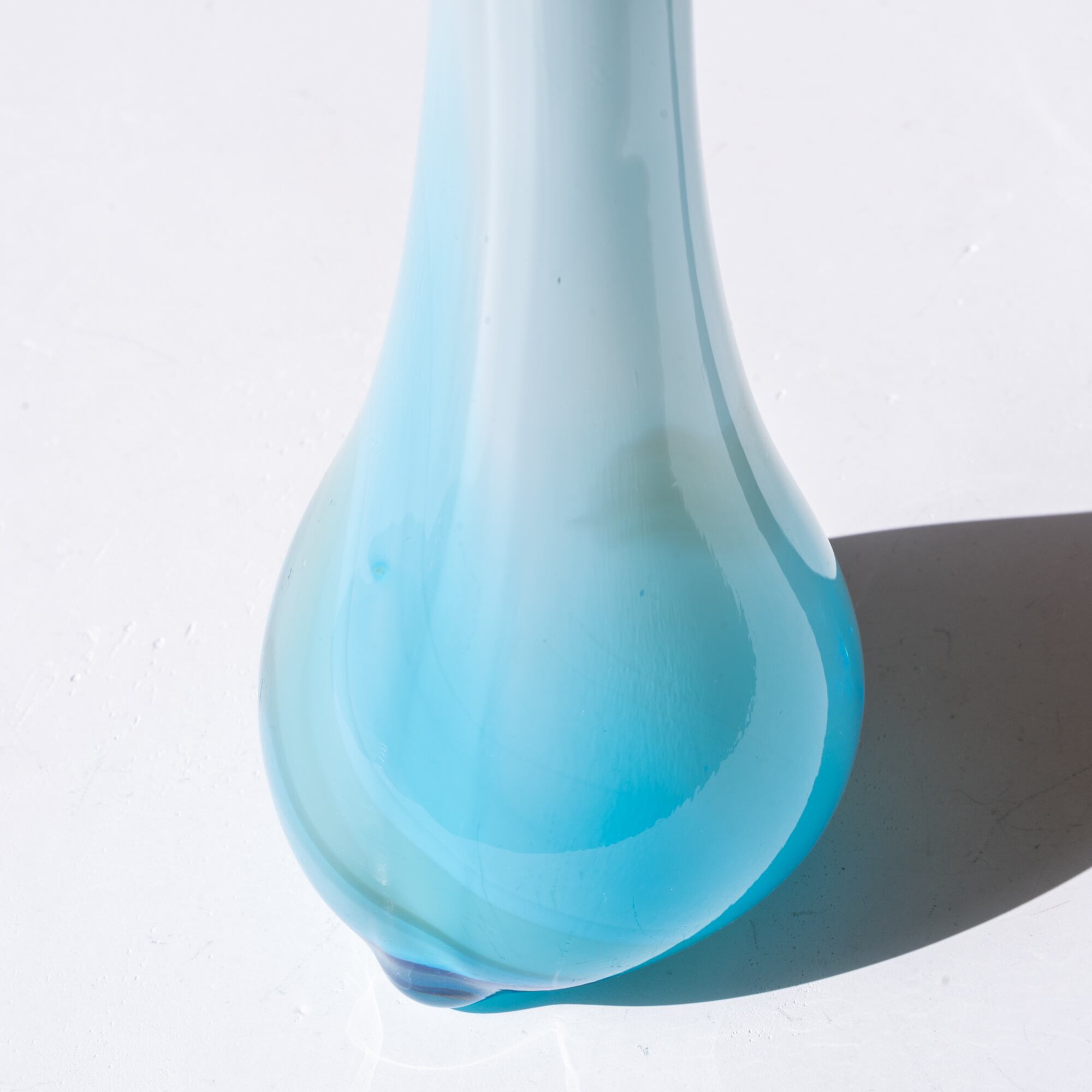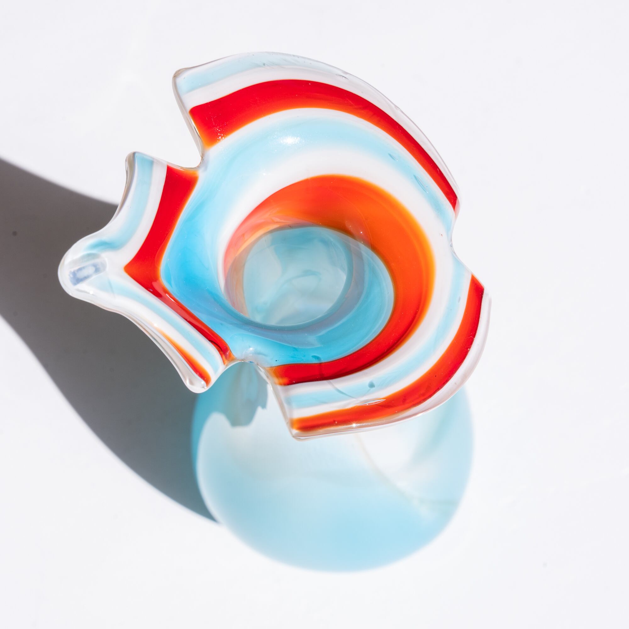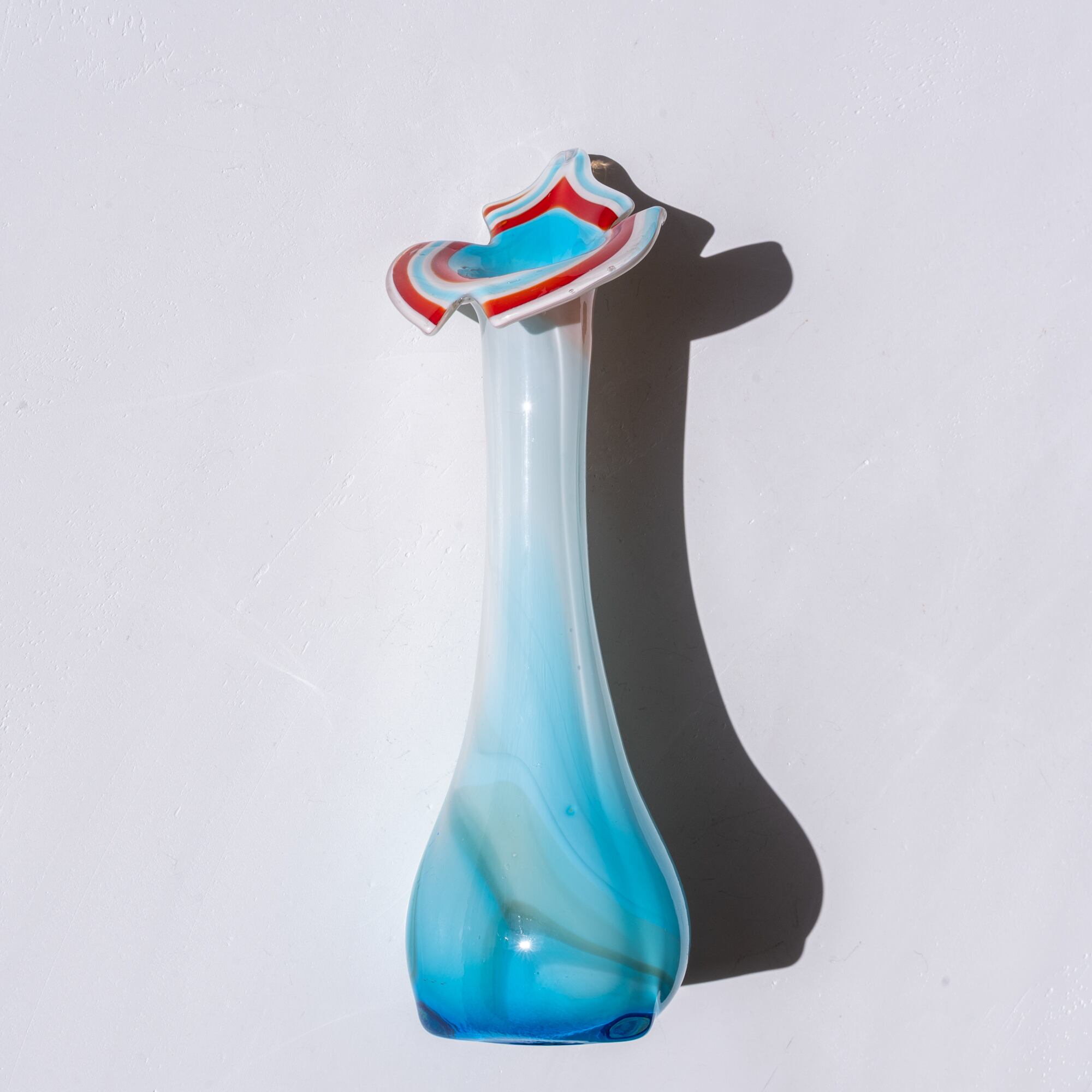 空に広がる雲を描いたようなブルーとホワイトのグラデーション、エッジの効いた口元のデザインや、レッドのアクセントが効いた個性的なガラスアート。