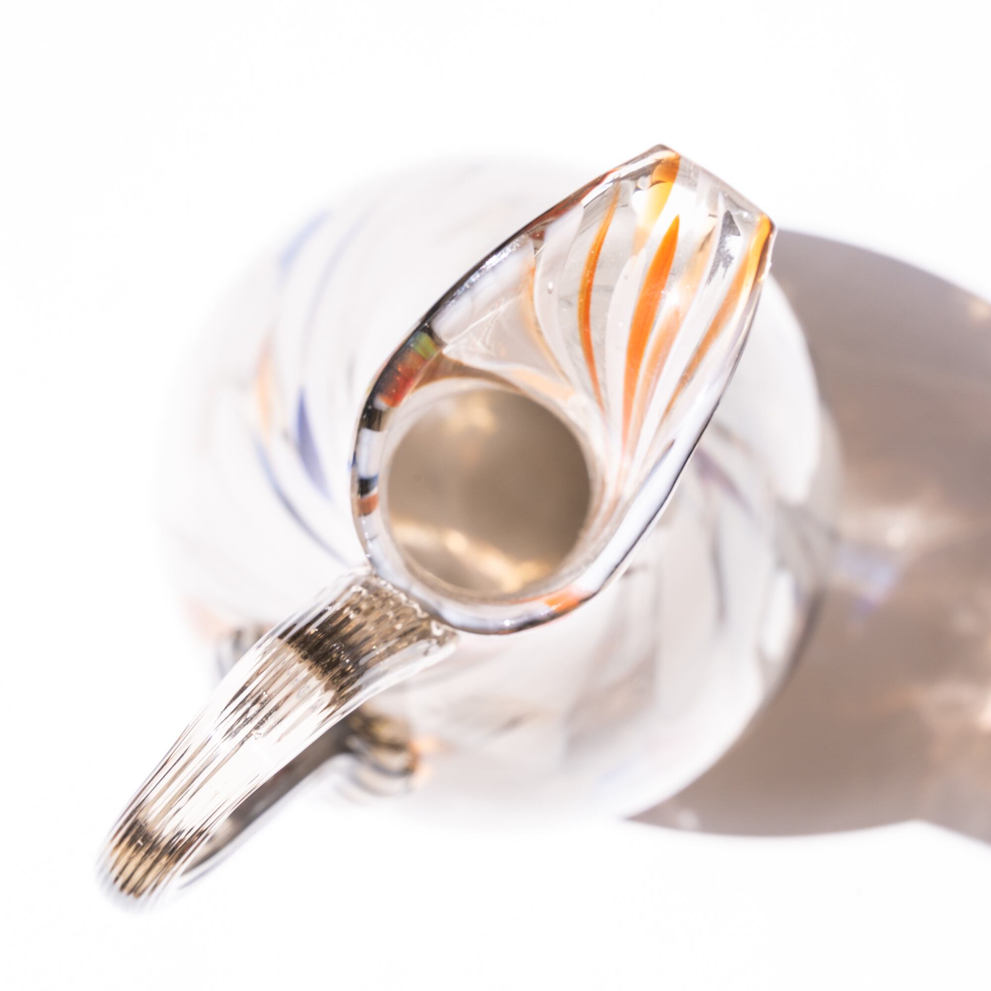 クリアガラスでできた持ち手には、細かくラインの入った装飾がほどこされています。