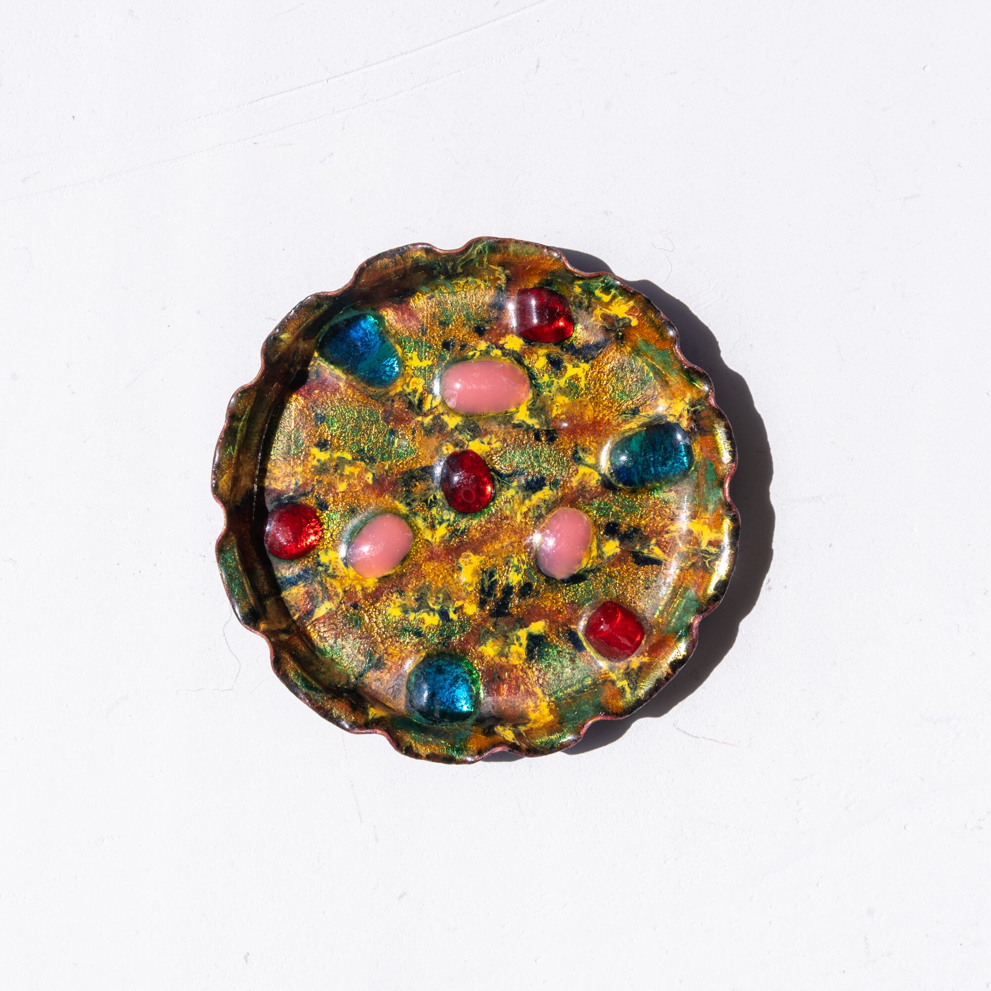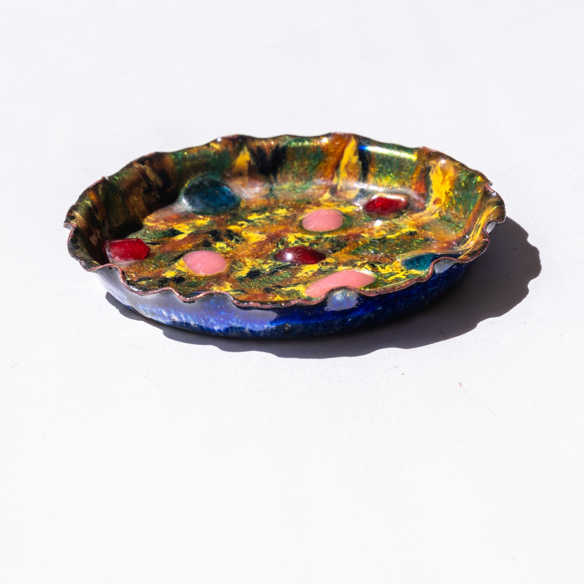 ピンク、レッド、ブルーのぷっくりしたアクセントが可愛い、トイ感のあるポップなデザイン。