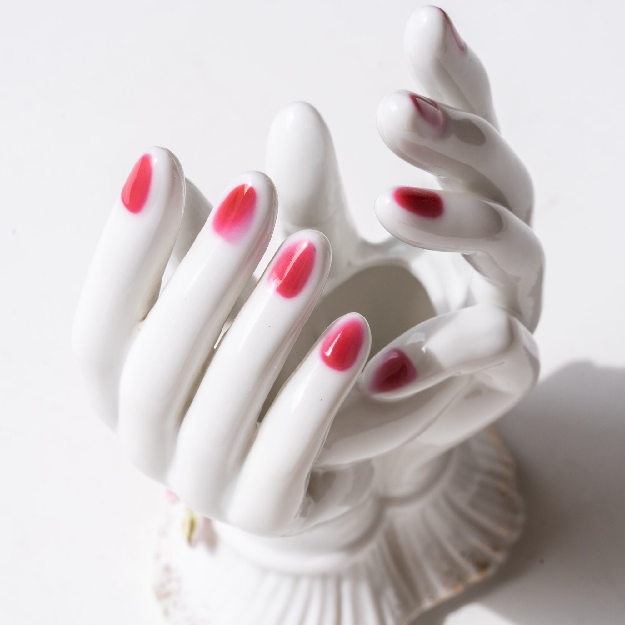 チェリーピンク色のネイルや袖のデザインに惹かれる、ディティールまでこだわりが感じられる特別な一品です。