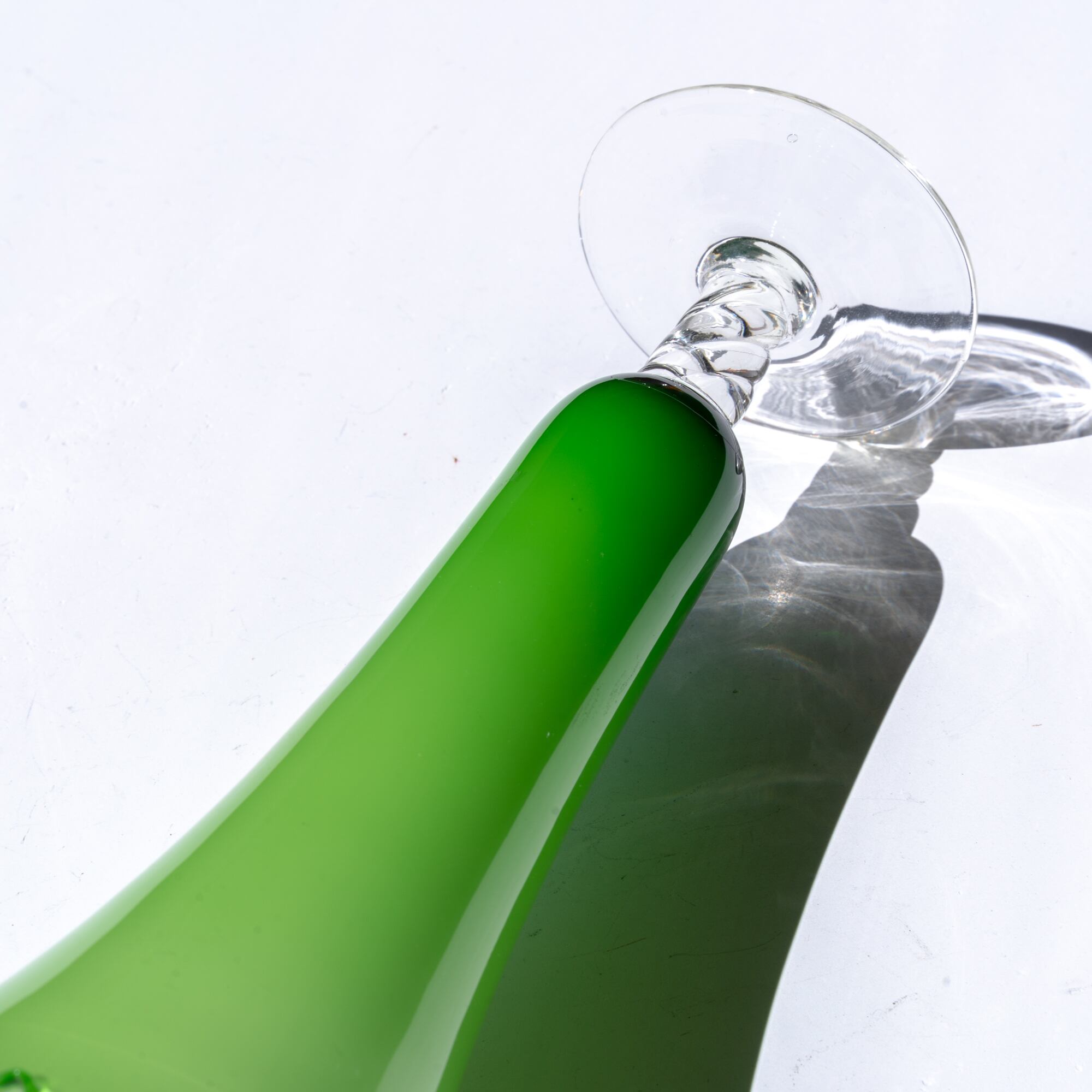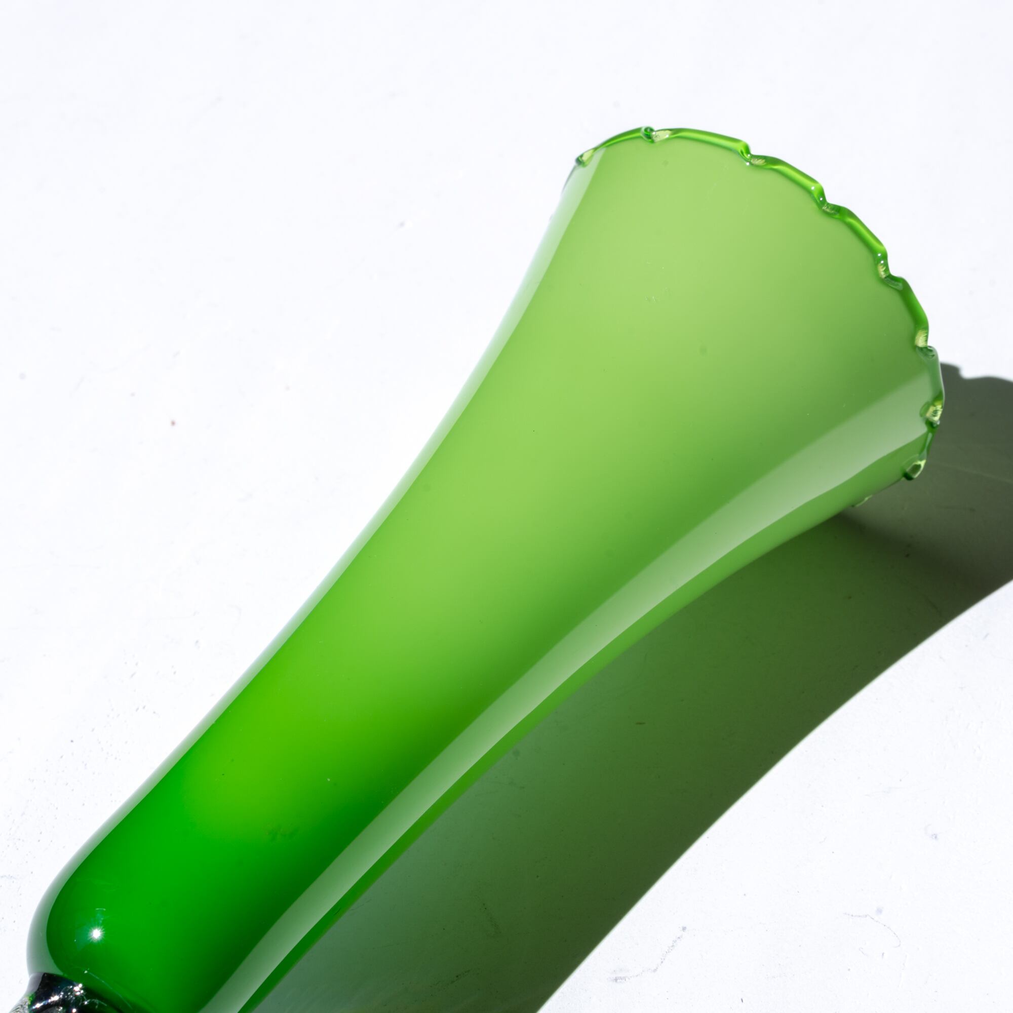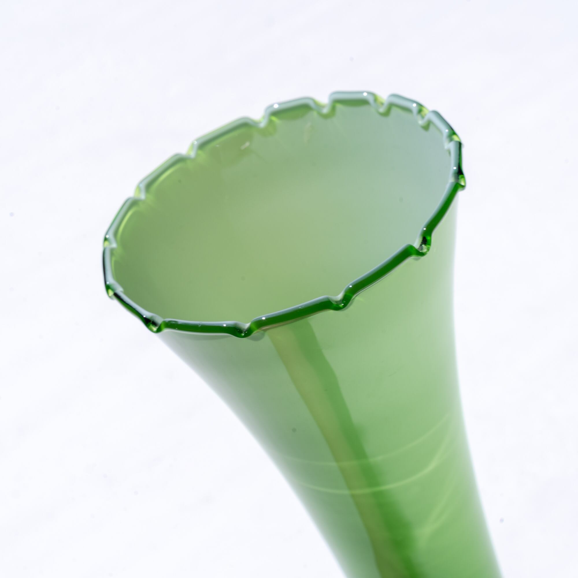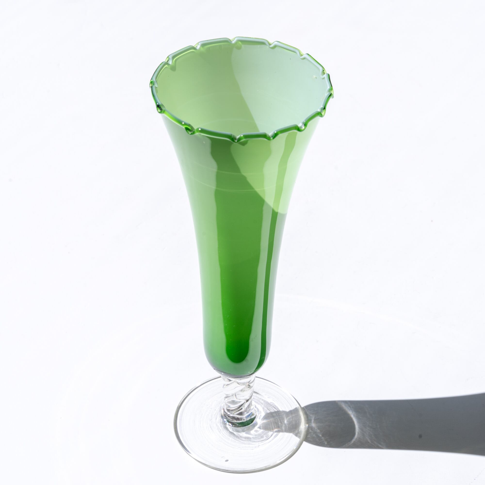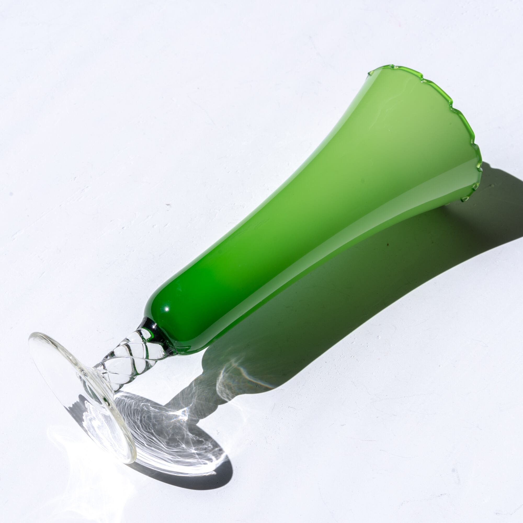 ミルキーなエメラルドグリーンとなめらかな質感が絶妙で、フリルのデザインやクリアガラスのツイストした装飾も素晴らしいミッドセンチュリーな作品。