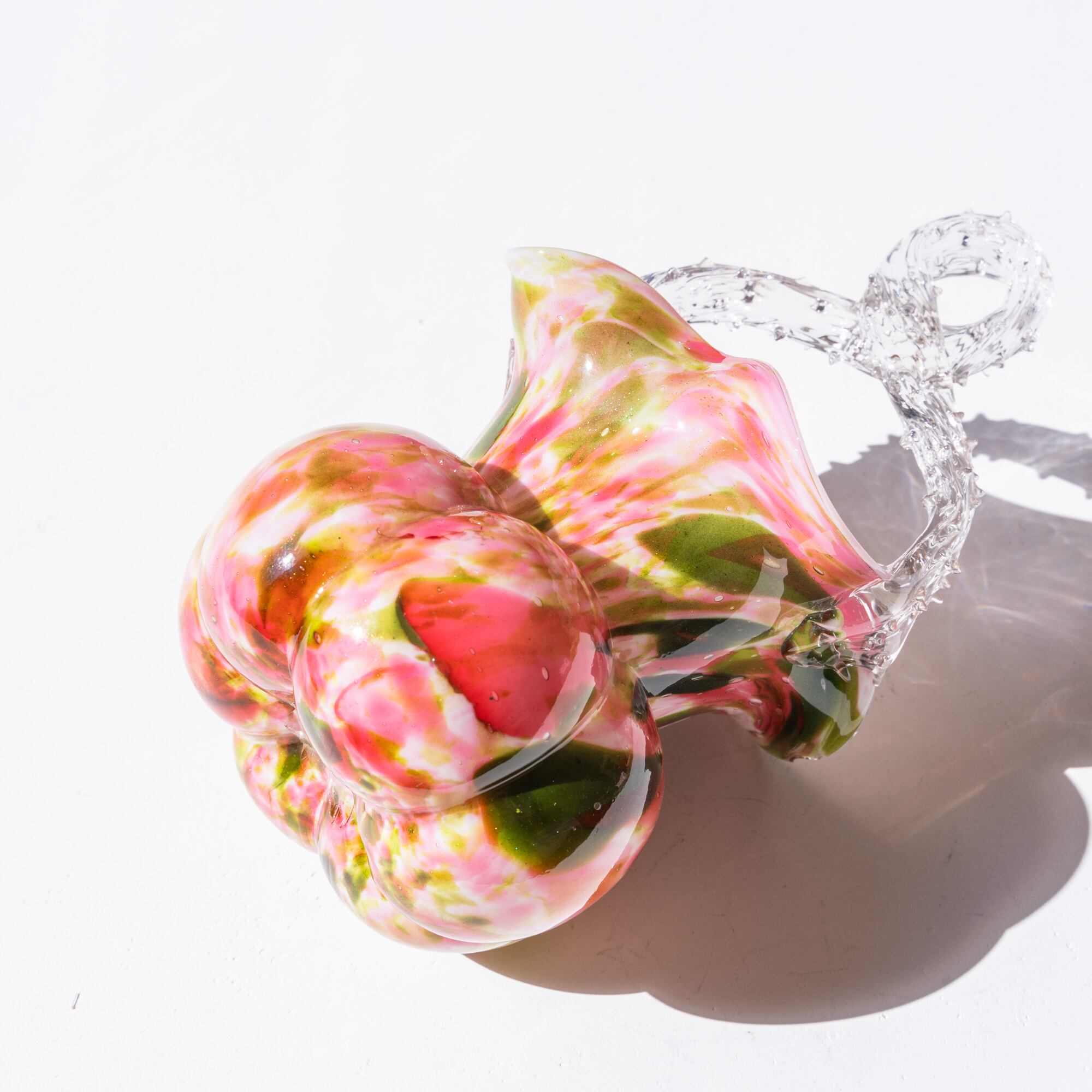 チェリーピンクとオリーブグリーンに彩られており、大ぶりのフリル装飾や持ち手のクリスタルグラスもデザイン性の高いアイテム。