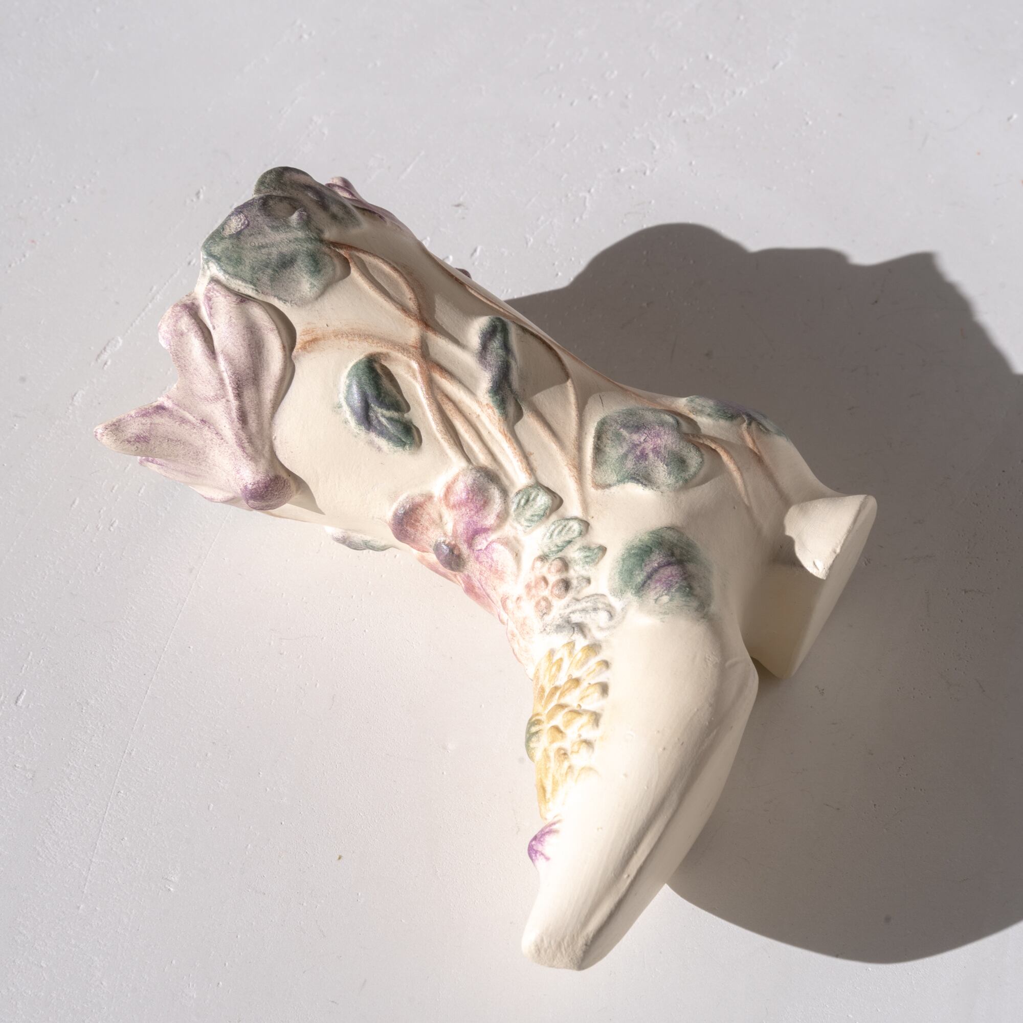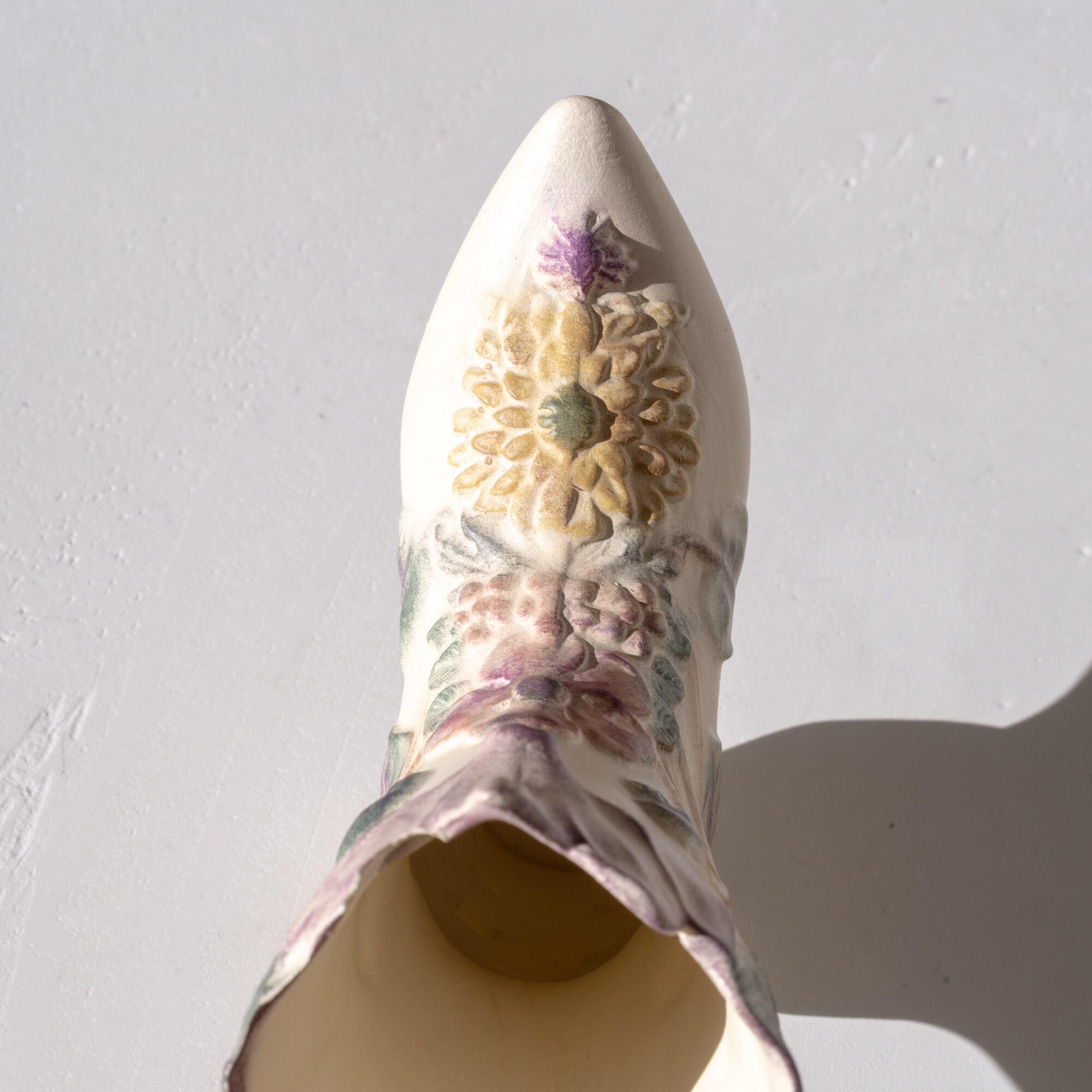 ブーツをモチーフにしたデザインで、繊細でしなやかな草花の表現が美しく、彩られた花々が香るようなヴィンテージアイテム。