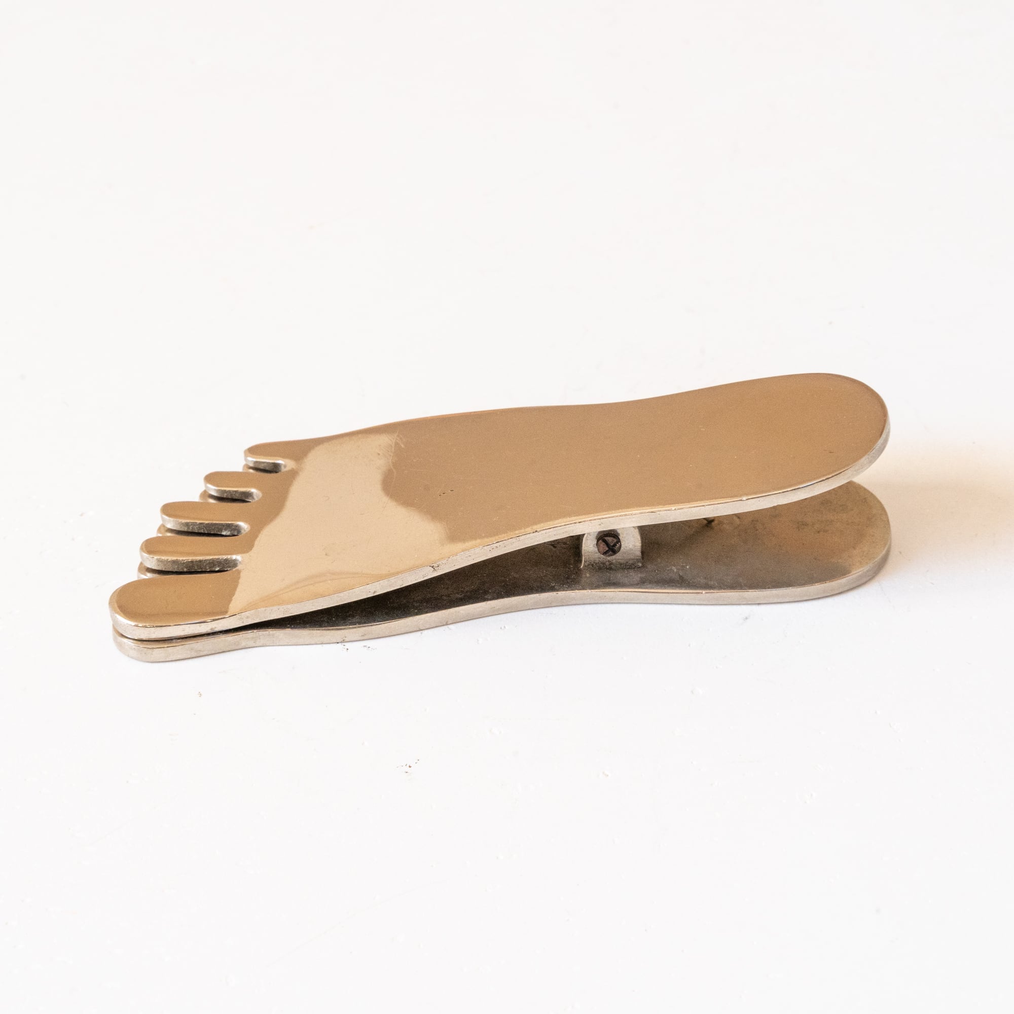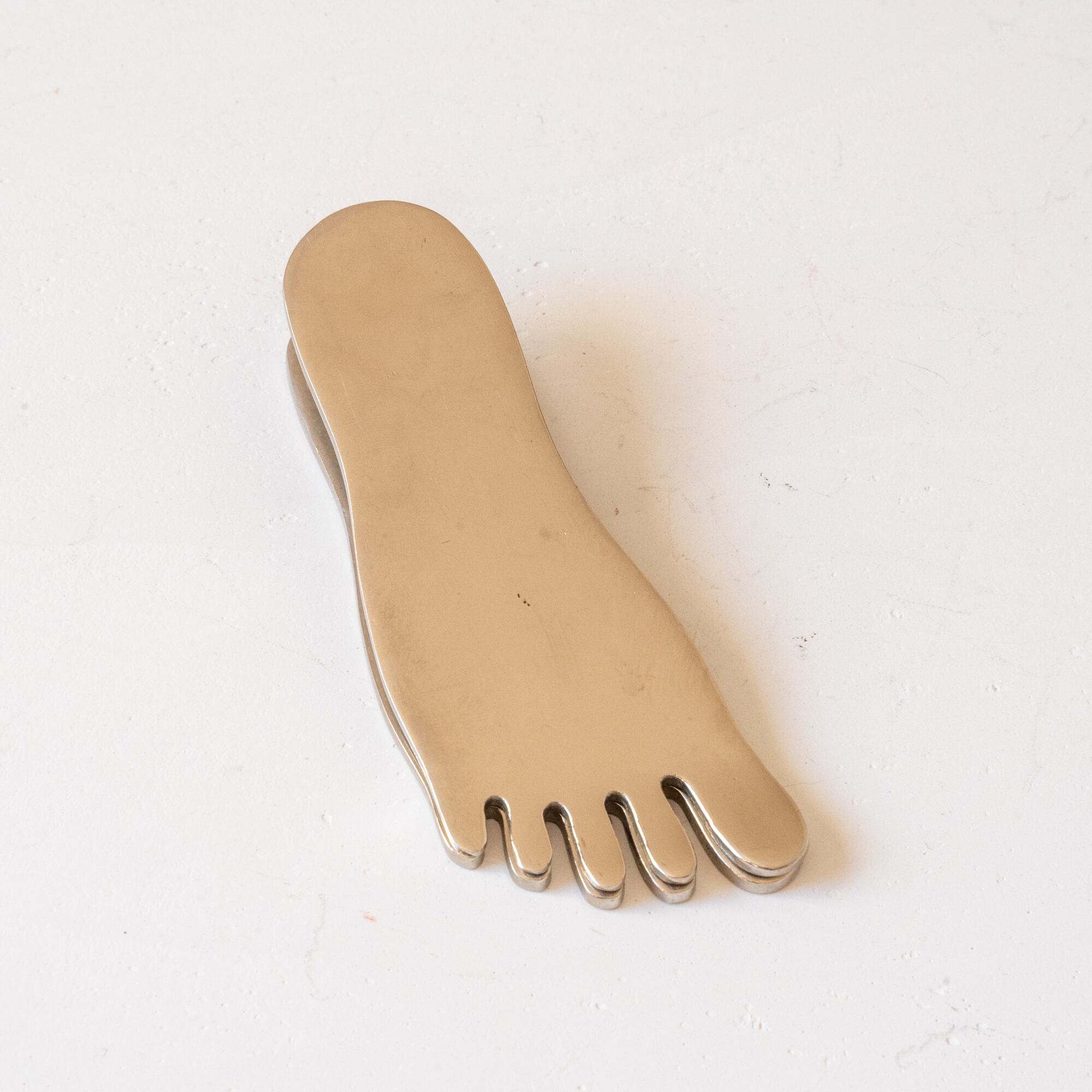 足をモチーフにつくられたデザイン、メタルの味わい深さが魅力的なアイテム。