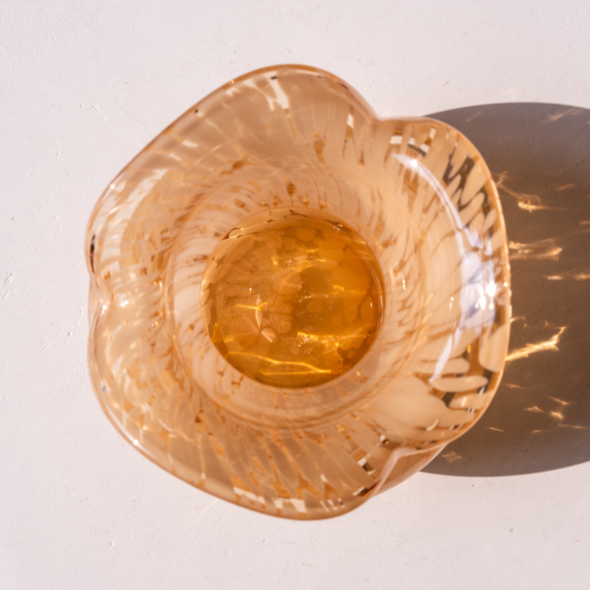 アンバー色のガラスに、ホワイトの模様が広がる美しいデザイン。